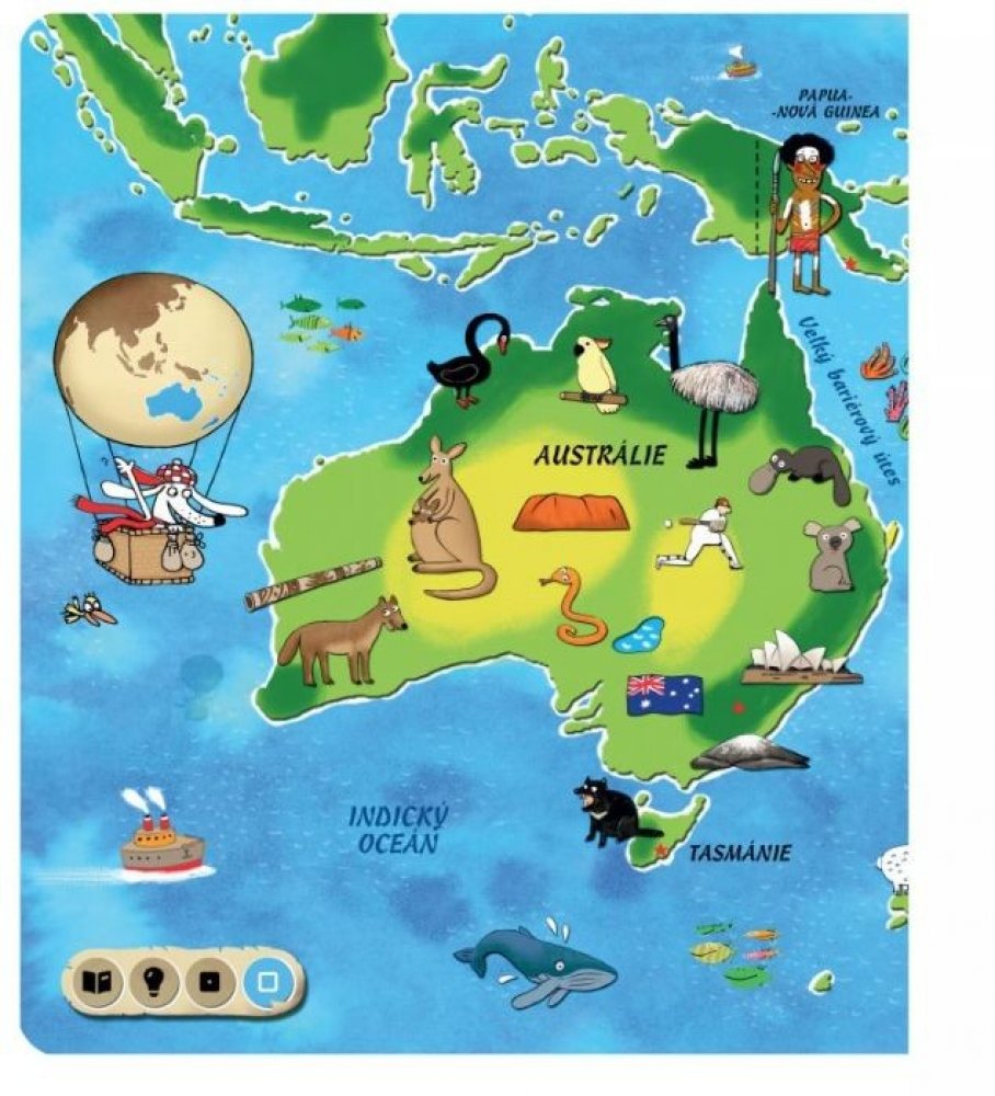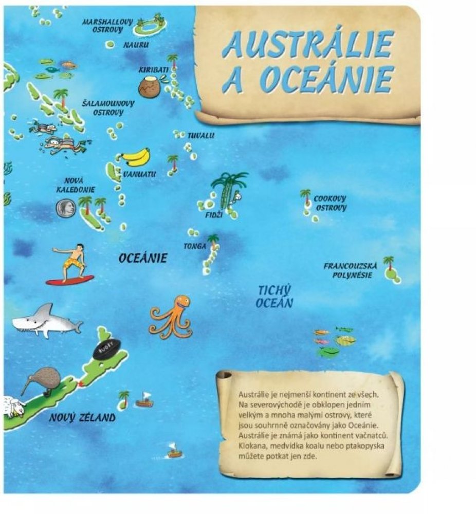 Tato kniha obsahuje osm různých map. Na jednotlivých stranách se seznámíte se všemi kontinenty, poznáte země na naší planetě a zjistíte, kde tyto země leží. Nechybí zde ani oceány, moře, velké řeky a pohoří, které jsou nedílnou součástí naší planety. Obrázky na mapách vám ukáží, jaká zvířata, stavby či jiné zajímavosti můžete v jednotlivých zemích najít.
