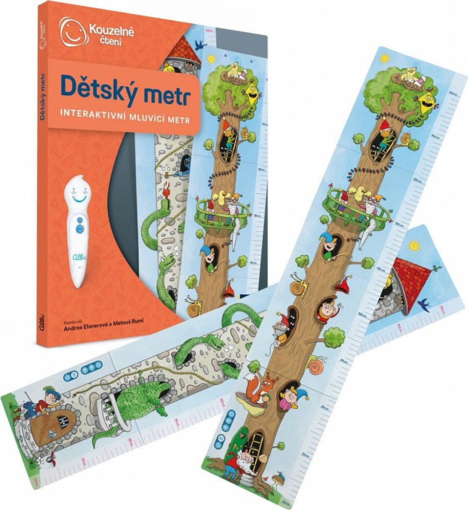 Oboustranný nástěnný metr děti nejen změří, ale zavede je i do světa pohádek. Na jedné straně je pobaví princ zachraňující princeznu a draka ze spárů zlého rytíře Bořislava z Lotrovic a na druhé straně strom plný skřítků. Které postavičky budou děti provázet, je jen na nich.