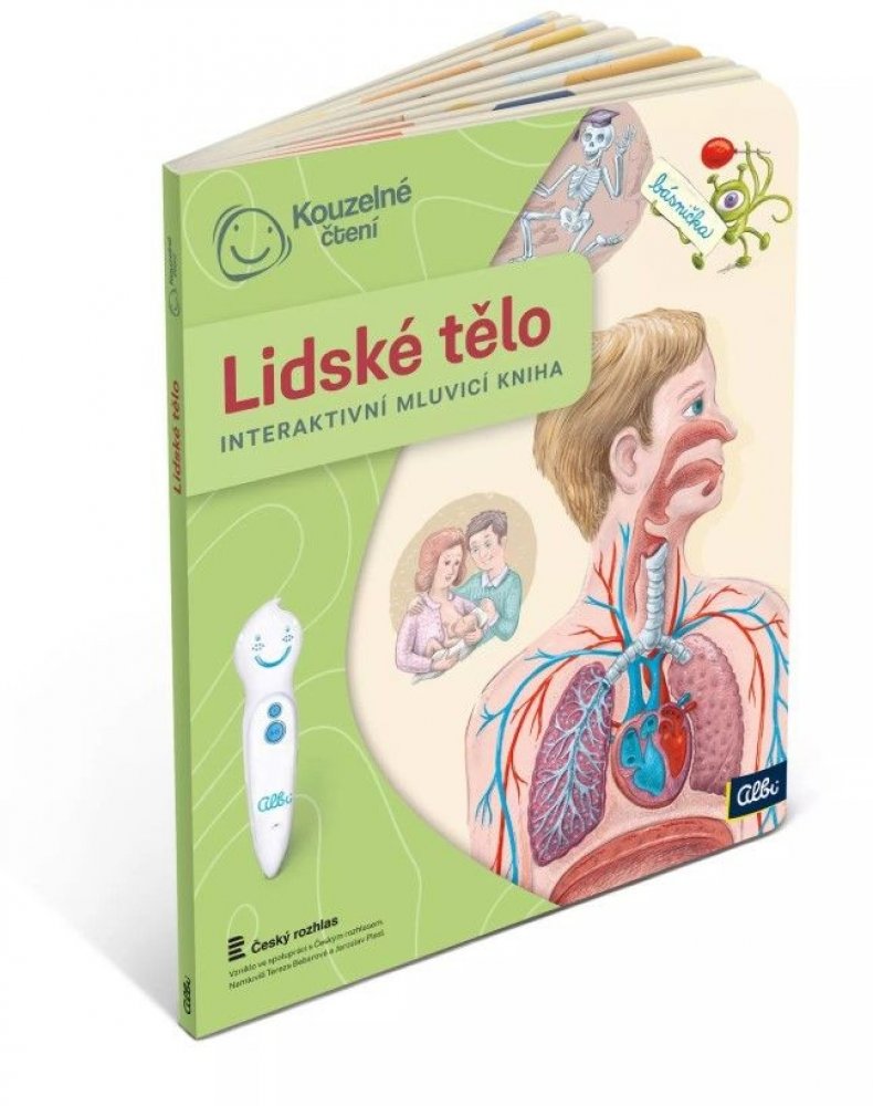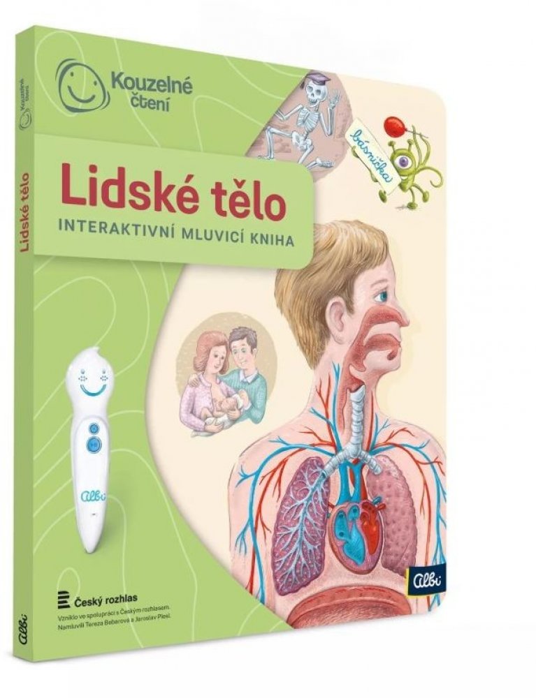 UPOZORNĚNÍ: Tato kniha funguje pouze s elektronickou tužkou ALBI (není součástí balení). Interaktivní mluvící kniha z edice Kouzelné čtení, se kterou se děti již od 3 let dozvědí spoustu zajímavých a užitečných informací o našem těle. Knihou Lidské tělo provází malý ufon Prokouk, který přiletěl z planety Po, aby prozkoumal taje lidského těla. Všemu se diví a není divu: na planetě Po funguje všechno úplně jinak! Postava Prokouka a poutavé ilustrace podněcují děti k postupnému objevování jednotlivých částí a soustav lidského těla. Kniha je členěna do 8 kapitol a témata jsou např. Kosti a svaly, Mozek a nervy, Rozmnožování, Trávicí soustava, Srdce a plíce atd. Na každé dvoustraně najdou malí i velcí průzkumníci návod na cvik. Když si všechny cviky propojí, vznikne sestava, kterou si mohou zacvičit a krásně se přitom protáhnout. V knize Lidské tělo najdete také básničky, zábavné kvízy a speciální ikony, které děti vybízí, aby si získanou informaci zkusili doslava na vlastní kůži. Kniha obsahuje téměř 2000 zvuků a textů. Knihu ilustroval Pavel Pecina, básničky napsal Robin Král, texty Lucie Ujcová. Vzniklo ve spolupráci s Českým rozhlasem, knihu namluvili Tereza Bebarová a Jaroslav Plesl. Kouzelné čtení je unikátní výukový systém, který vám přináší spoustu informací a zábavy. Stačí, když se lehce dotknete elektronickou tužkou obrázku nebo textu, ozve se příslušná informace, zvuk nebo hudba. Kouzelné čtení je určeno dětem v předškolním věku, tak dětem starším, ale bezpochyby zaujme i dospělé. Díky speciální technologii mohou knihy plně využívat i děti v předškolním věku, které ještě číst neumí. Samy si tak mohou „přečíst“ pohádku nebo se hravou formou naučit poznávat barvy, čísla, písmena či nejrůznější tvary. Kouzelné čtení - ilustrační video