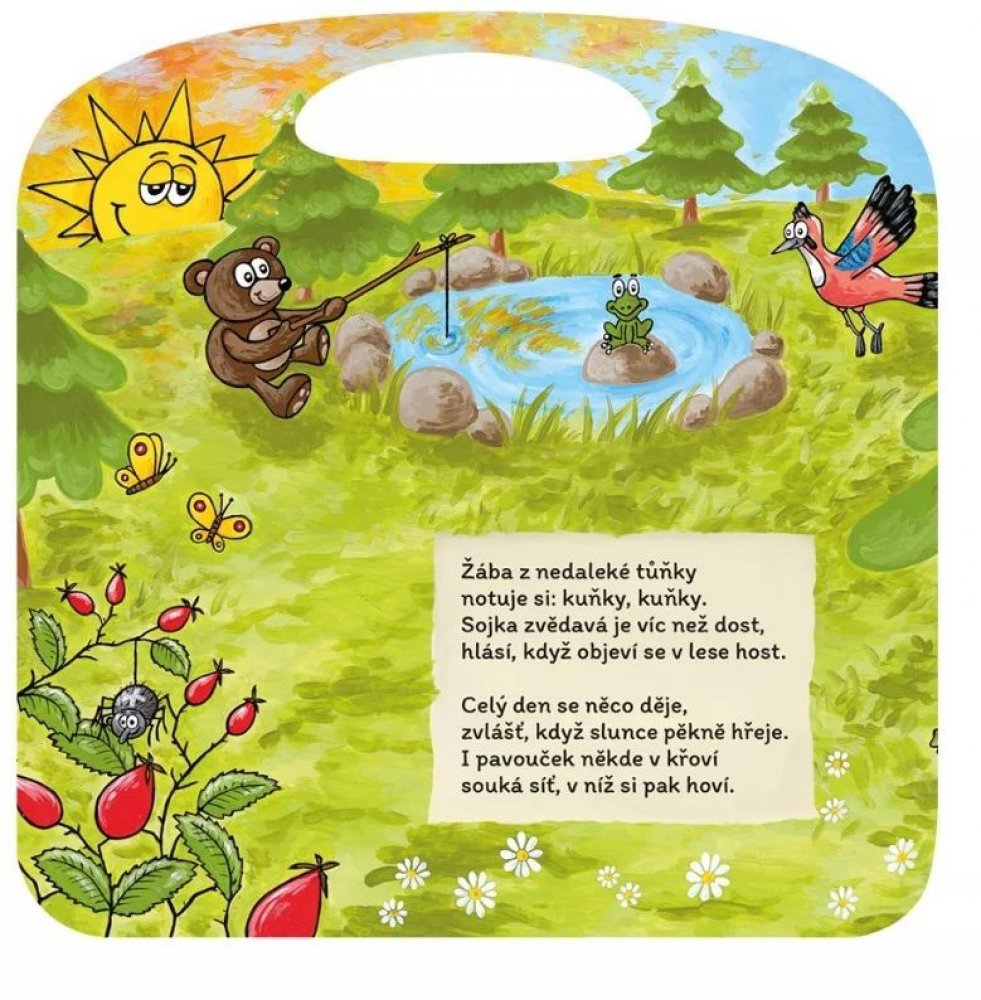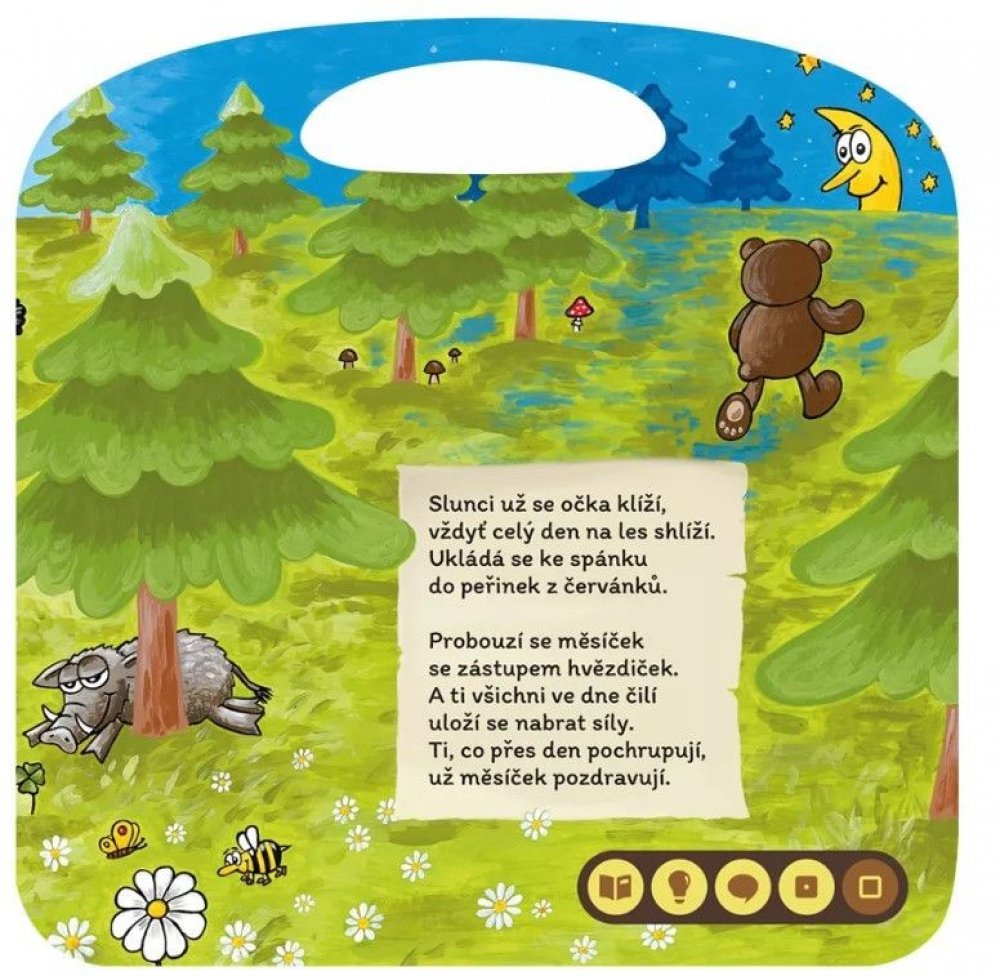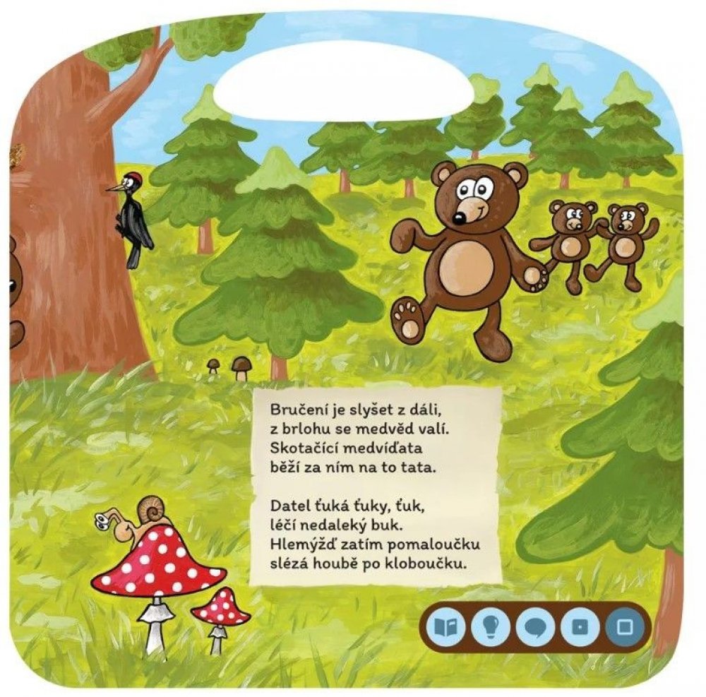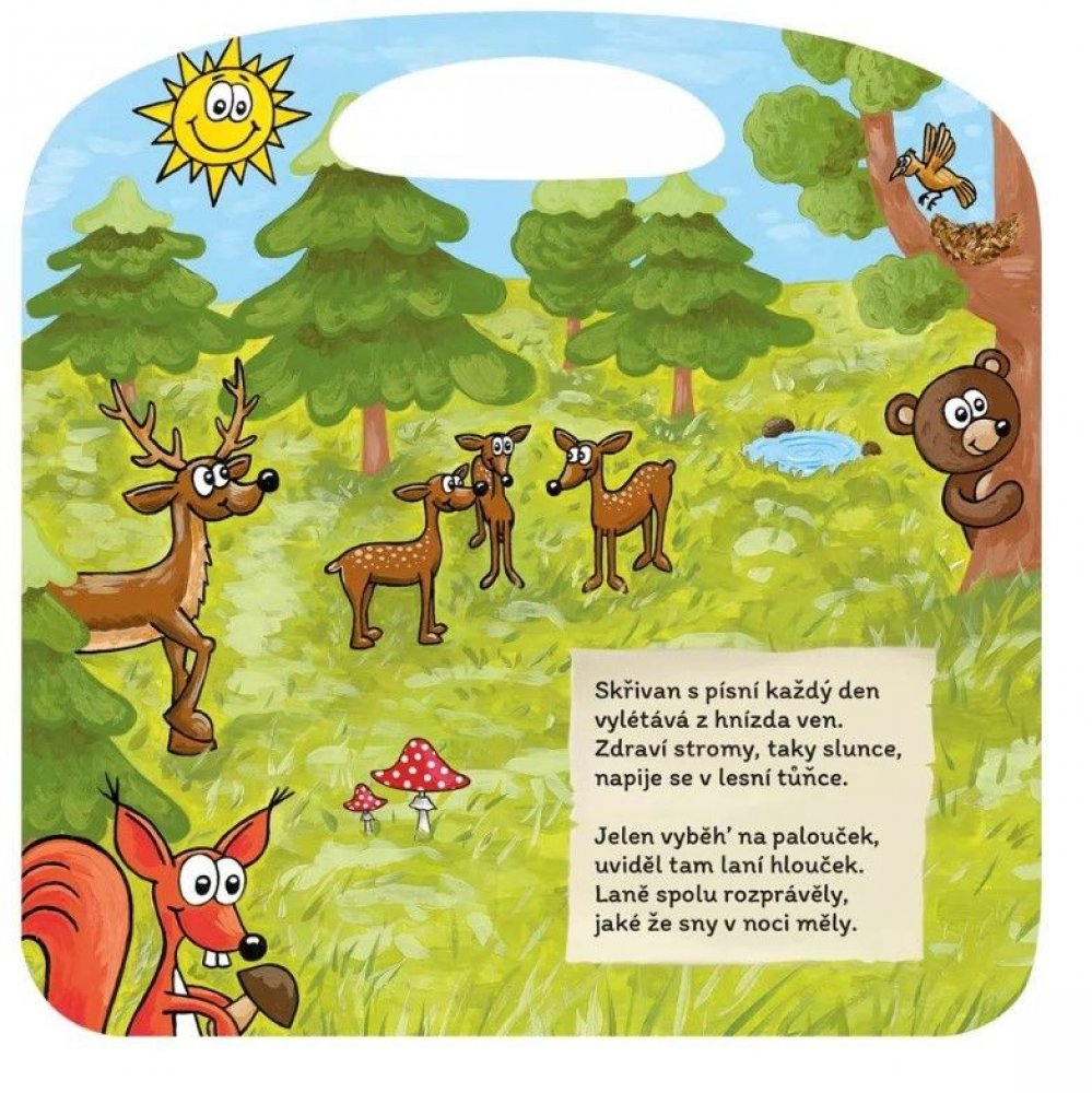 Kdo tu bručí a tam houká? Kdo to z nory na nás kouká? Kdo to v noci tiše cupká, ve dne potom v klidu chrupká? Co se jenom v lese děje? Kdo se z křoví na nás směje? Ať je noc či den, les nikdy úplně nespí. Seznamte se s obyvateli lesa díky této básničce.