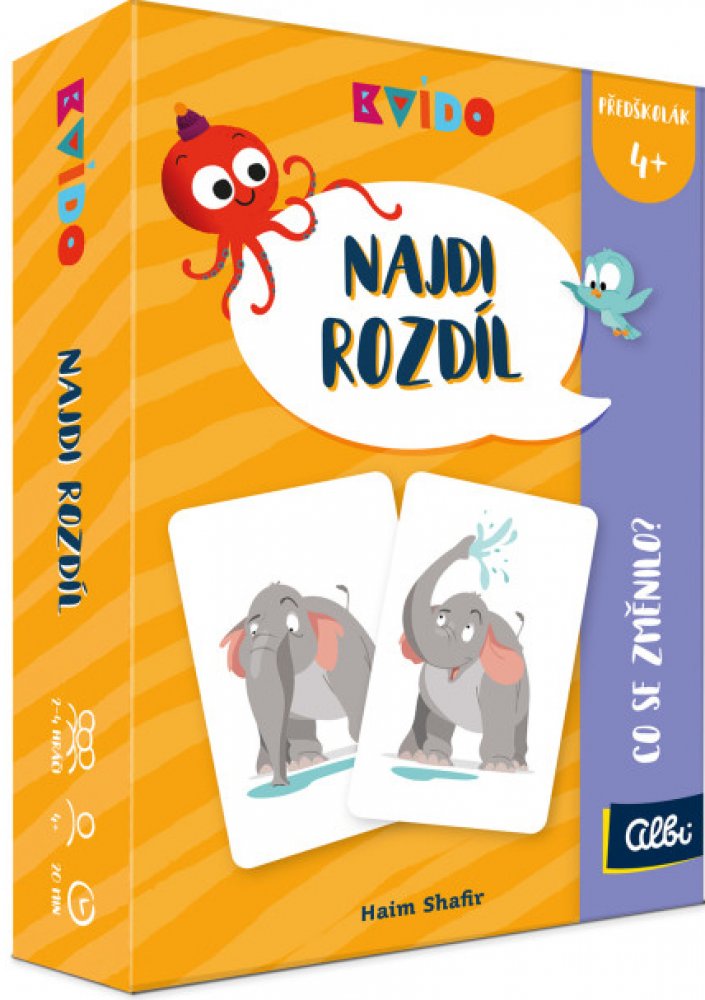 Najdi rozdíl Hra je zaměřená na váš postřeh. Poznej co nejdříve rozdíl, zbav se karet a vyhraj! Prohlédněte si karty na stole. Všichni až na jednoho hráče zavřou oči. Ten obrátí náhodnou kartu, takže se obrázek lehce změní. Hráč, který jako první rozdíl objeví, může přidat na stůl jednu ze svých karet. Kdo se jako první zbaví karet, vyhrává! Hra Najdi rozdíl poskytuje skvělý způsob, jak rozvíjet důležité dovednosti. Hráči se v této hře nejenom baví, ale také posilují paměť, postřeh a rychlé rozhodování. Hra obsahuje: 32 oboustranných karet s lehce odlišnými obrázky a pravidla hry.