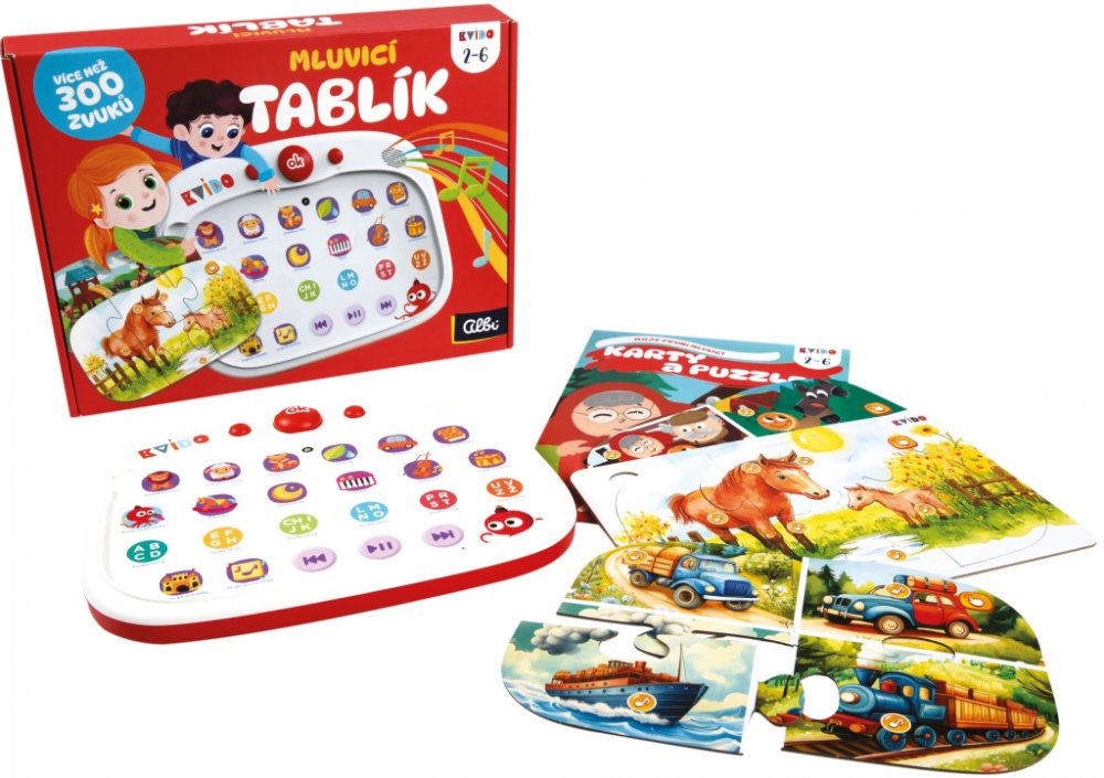 Balení obsahuje: dotykovou tabulku – Mluvicí tablík, 2 oboustranné puzzle (4 motivy s dopravními prostředky a zvířátky z farmy s ozvučenými obrázky a kvízy), 2 oboustranné ozvučené karty (4 obrázky s motivy dětského hřiště, pískoviště a české pohádky O Koblížkovi se zvuky a kvízy), adaptér na stahování dalších zvukových souborů.