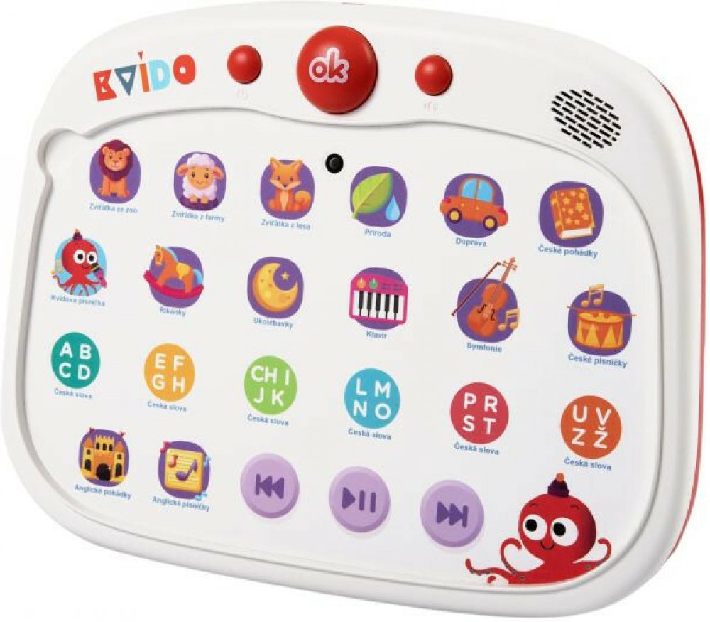 Dotykový tablík se zvuky a kvízy. Tablík, který je v českém jazyce, je doplněn o pohádky a písničky v angličtině.