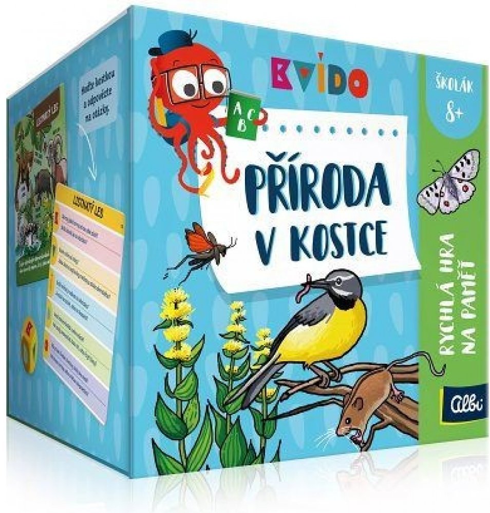 Hry Kvído V kostce navazují na oblíbené hry V kostce, ale tentokrát jsou propojeny s oblíbenou dětskou postavou chobotničky Kvída. Na každé ze 60 ilustrovaných karet jsou znázorněny informace z určité oblasti. Hráči mají patnáct vteřin, aby si toho z ní zapamatovali co nejvíce, a zvládli odpovědět na jednu až dvě vylosované otázky. Pokud si na hrací kostce hodí obrázek Kvída, nastává kolo s bonusovou Kvídovou paměťovou hrou. Tu hrají všichni hráči zároveň - snaží se pokrýt svoji kartu správnými žetony podle toho, jak si zapamatovali předlohu. Kvído V kostce obsahuje: 60 karet s obrázky i otázkami k danému tématu, 20 oboustranných bonusových karet pro Kvídovu paměťovku, 4 bodovací karty, 32 obrázkových žetonů pro bonusový úkol, 40 bodovacích žetonů, 1 přesýpací hodiny na 15 sekund a 1 Kvídovu hrací kostku.