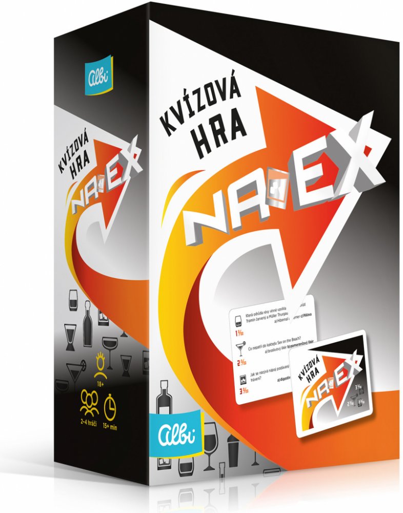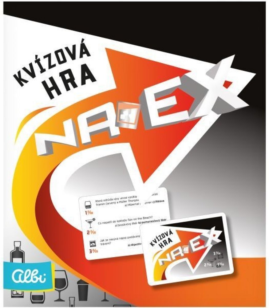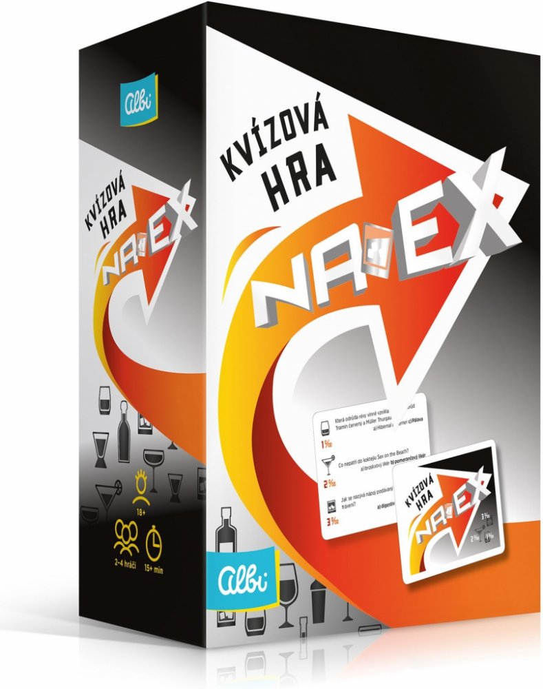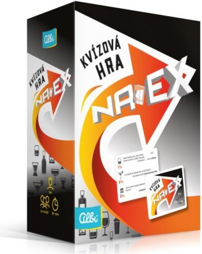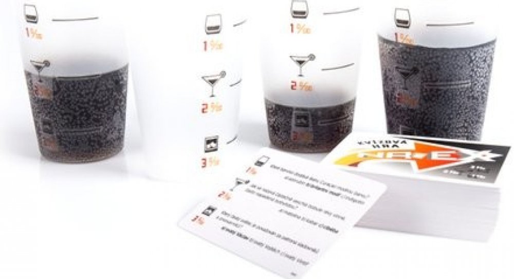 Kvízová hra Na ex! obsahuje: 100 karet s otázkami a 4 kelímky.