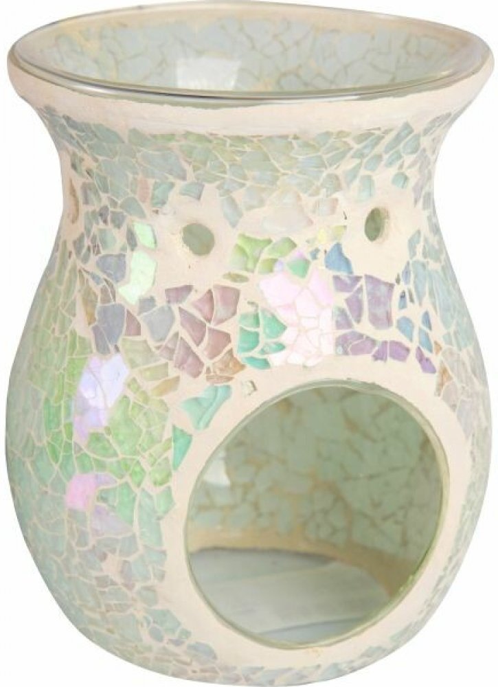 Mozaiková aromalampa s perleťovými kousky skla. Stačí přidat trochu vody a pár kapek esenciálního oleje, nebo vonný vosk. Rozměry: 10,5 × 14 cm Návod k použití: Umístěte aromalampu na rovný a žáruvzdorný povrch mimo jiné zdroje tepla a hořlavé předměty. Do misky vložte vonný vosk, či vodu s pár kapkami esenciálního oleje. Pod miskou zapalte neparfémovanou čajovou svíčku. Upozornění: Před použitím odstraňte obal. Ujistěte se, že lampa je umístěna na rovném, stabilním povrchu. Během užívání může být lampa horká - nedotýkejte se jí, ani ji nepřemisťujte, dokud opět nevychladne.