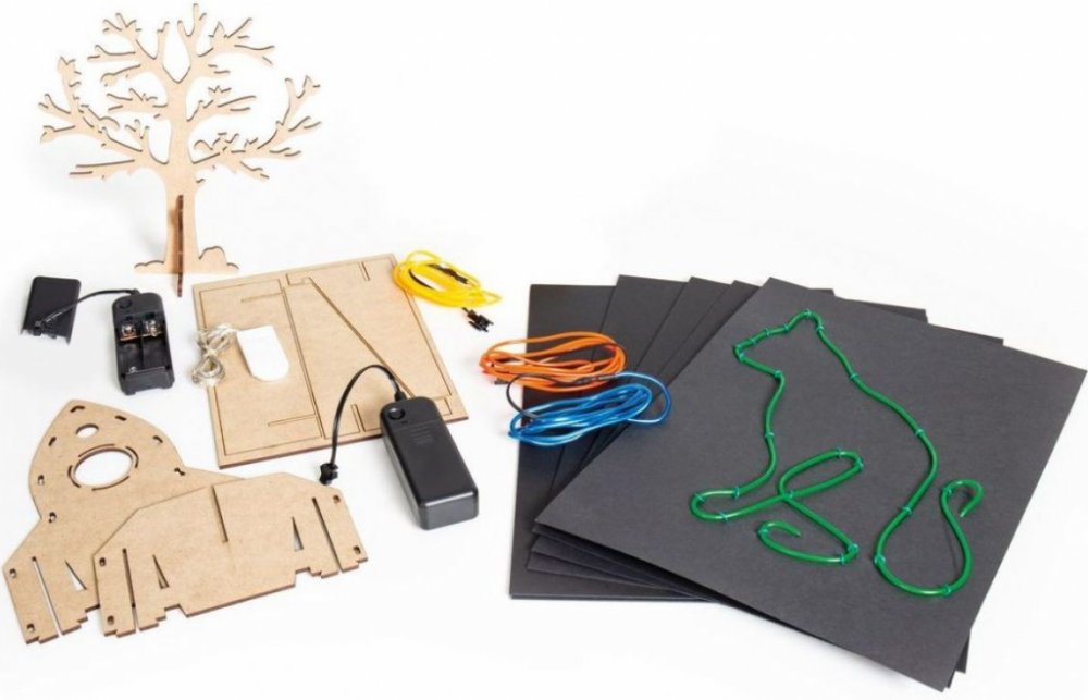 Sada Neonové obrázky obsahuje: sadu vodičů (červená, žlutá, zelená, modrá) síla 2,3 mm, vodič „rýžová zrnka“ – délka 2 m, 2 ks zdroj AA baterie, 50 ks upevňovacích drátků, 7 ks černého kartonu s potiskem (4 motivy), 3 ks MDF desky s vyřezaným tvarem a návod.