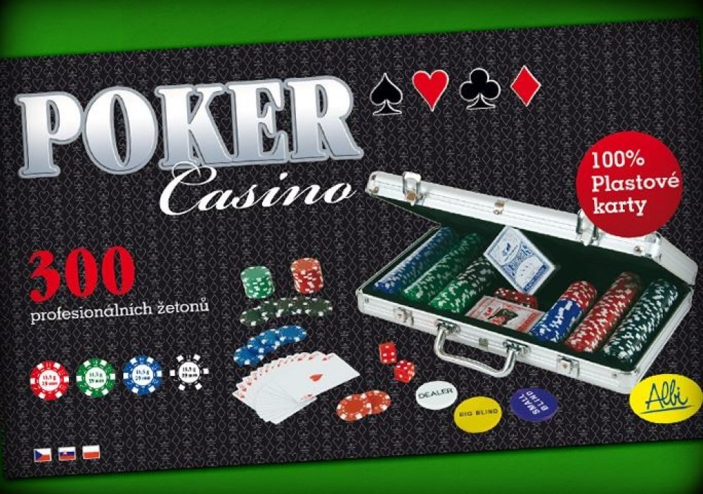 Klasický pokerový hliníkový kufřík ve stříbrné barvě, který obsahuje 300 kvalitních 11,5 gramových žetonů a 2 balíčky plastových karet...