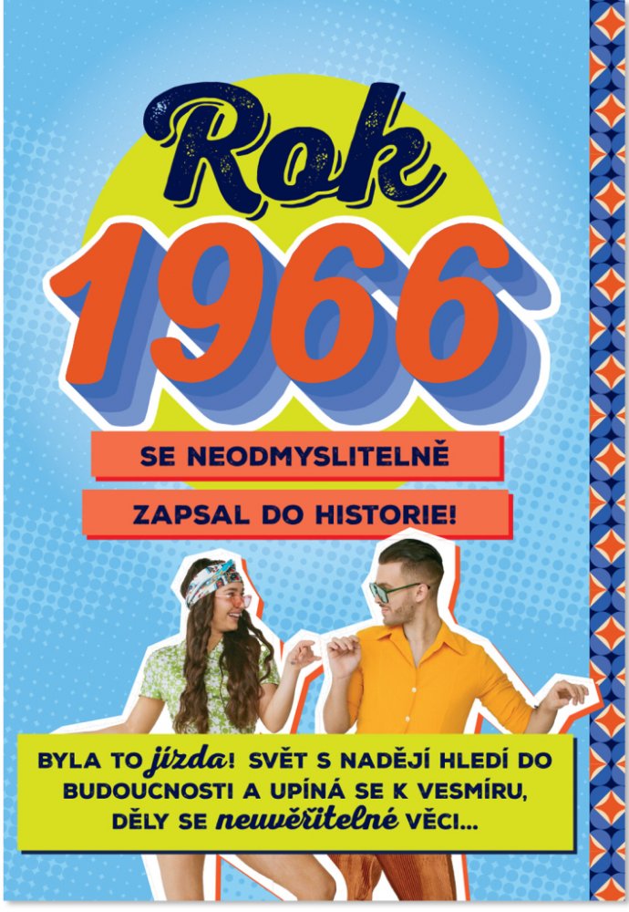 Svět v roce 1966 s nadějí hleděl do budoucnosti a upínal se k vesmíru. Luna 10 se stala první umělou družicí měsíce a na obrazovkách se objevil Star Trek. Dlouhé vlasy byly u mužů nepřípustné a světlo světa spatřil třeba herec Jiří Langmajer. Udělejte radost retro přáníčkem a zavzpomínejte společně s oslavencem, co výjimečného se v roce jeho narození stalo. Na přání najdete zajímavé události, které se v daném roce odehrály, a také známé osobnosti, které se v témže roce narodily. Rozměry přáníčka: 13,5 cm × 19,5 cm