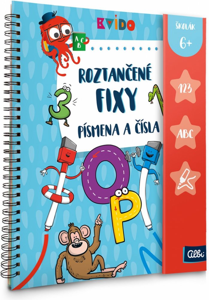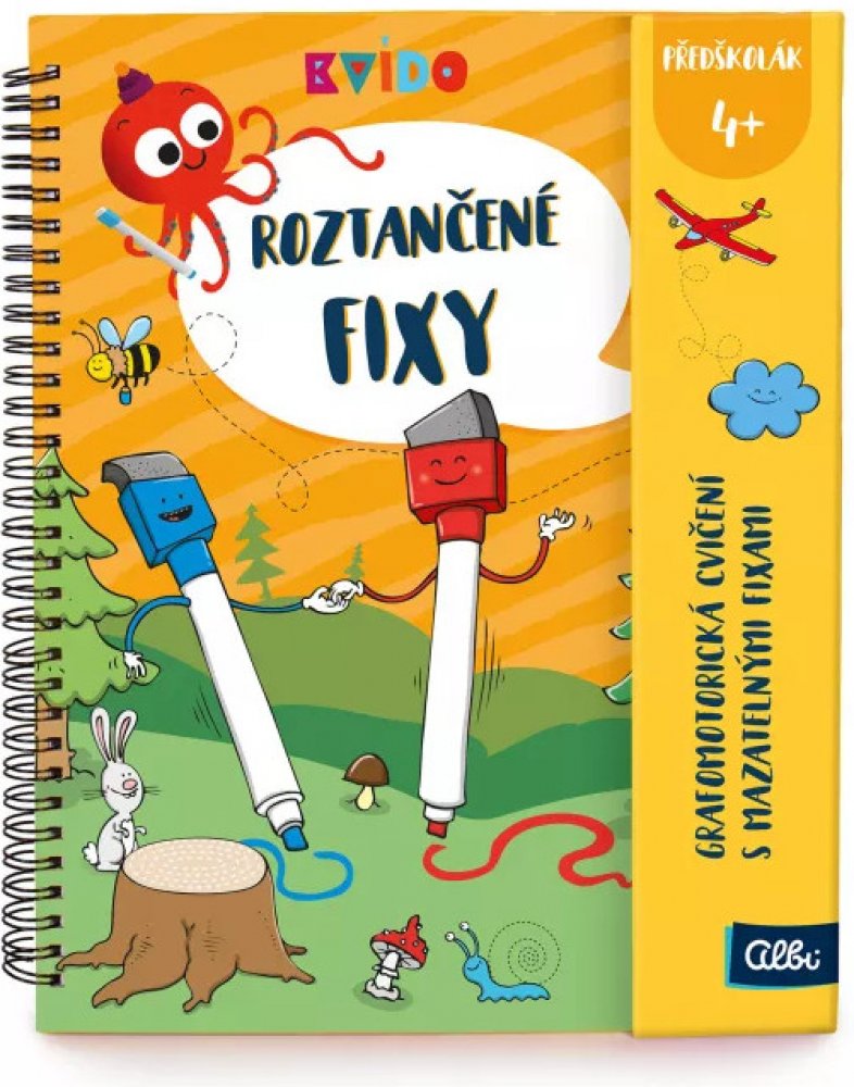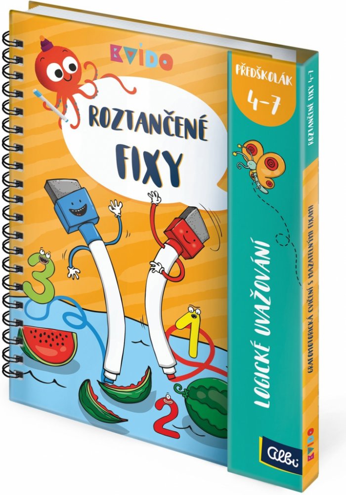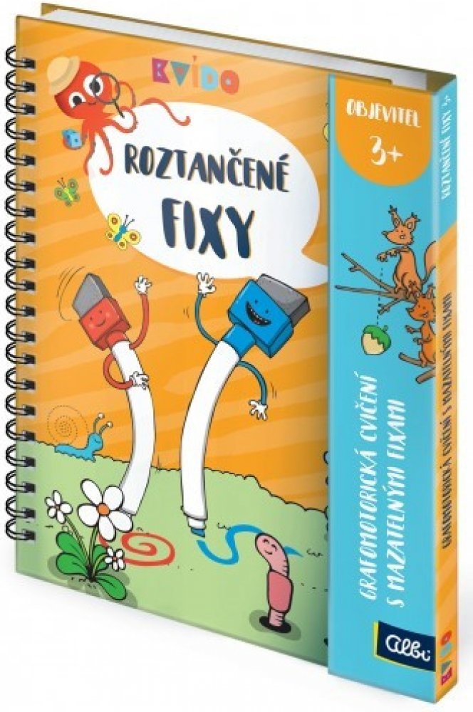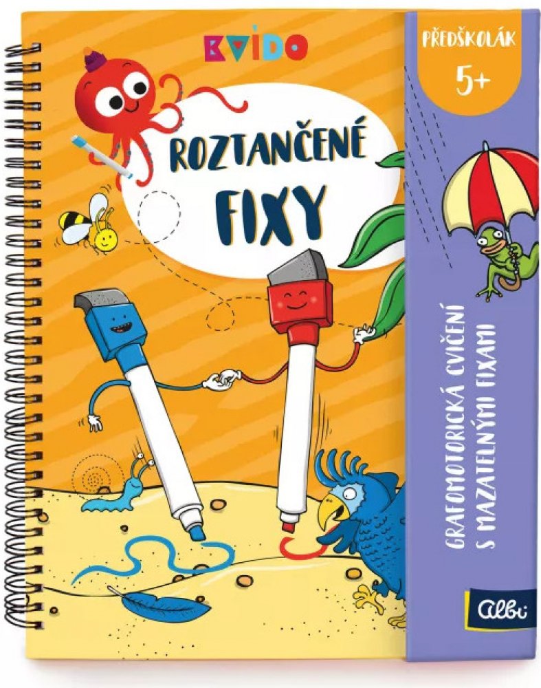 1. MÍSTO V SOUTĚŽI HRAČKA ROKU 2021 V soutěži Hračka roku 2021 v kategorii Baby a předškolní hračky získaly Roztančené fixy první místo. Více zde Roztančené fixy jsou interaktivní grafomotorické sešity plné obrázků a aktivit s příběhy 2 barevných fixek, které učí Kvída a předškolní děti kreslit a psát a rozvíjet přitom jemnou motoriku a zrakové vnímání. Díky mazatelným fixům můžou děti sešity vyplňovat opakovaně a procvičovat si tak úkoly znovu a znovu. Každý sešit Roztančené fixy má 50 stran plných úkolů pro děti předškolního a mladšího školního věku. Kroužková vazba a zavírání na magnet je vhodné i do batůžku na cesty. Nově obsahují fixy všech vydání gumové delfínky, které napomáhají správnému úchopu.