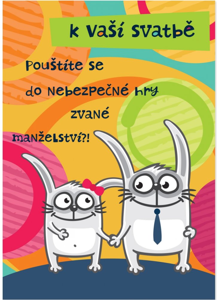 Žádný svatební dar se neobejde bez svatebního přání. Svatební přání si můžete napsat sami, nebo využít již předepsané texty. Na přáníčku je text: K Vaší svatbě. Pouštíte se do nebezpečné hry zvané manželství?! Uvnitř přáníčka je text: Střihněte si, kdo začne první... ...přineste si kostku a místo figurek můžete použít snubní prstýnky. Hra může začít! Cesta manželstvím - Start - Svatba Líbánky - 3 dny a 3 noci vášnivého sexu Tě pořádně nakoply, jdi o 3 políčka dopředu. Nový byt - Hypotéka na 20 let Tě pořádně zdrží, jedno kolo stojíš. První dítě - V noci několikrát vstáváš k plačícímu miminu, tak udělej 10 sedů lehů. Babysitting - Dejte si páku o to, kdo vyrazí v pátek večer za zábavou a kdo bude hlídat. Nové auto - Koupili jste si větší auto a učíš se s ním couvat, takže couvni o 2 políčka. Přijede tchýně - Je potřeba uvařit, tak vyjmenuj 10 jídel začínajících na první písmeno z Tvého křestního jména. Druhé dítě - V noci vstáváš dvakrát víc, udělej 10 sedů lehů s výskokem. Rodinný výlet - Na každé rameno si dej pytel mouky, popatlej se zmrzlinou a oběhni dům. Hádka o novou sedací soupravu - Během 10 sekund vyjmenuj co nejvíce barev. Cíl - Vaše spokojené manželství Ať vždycky spolu dojdete zdárně do cíle. Hodně štěstí!