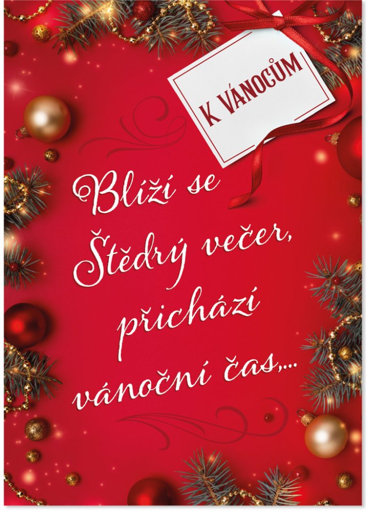 Vánoční hrací přání v červeném designu zdobí ozdoby a větvičky se světýlky. Přední stranu zdobí část milého textu, jehož zbytek najdete uvnitř přání. Můžete připojit také vlastní věnování či podpisy. Po otevření začne hrát část písně od Michala Davida - Čas Vánoc. Text přání: K Vánocům. Blíží se Štědrý večer, přichází vánoční čas... ...ať krásný je a plný lásky a zase sblíží nás. Krásné Vánoce! Ro...