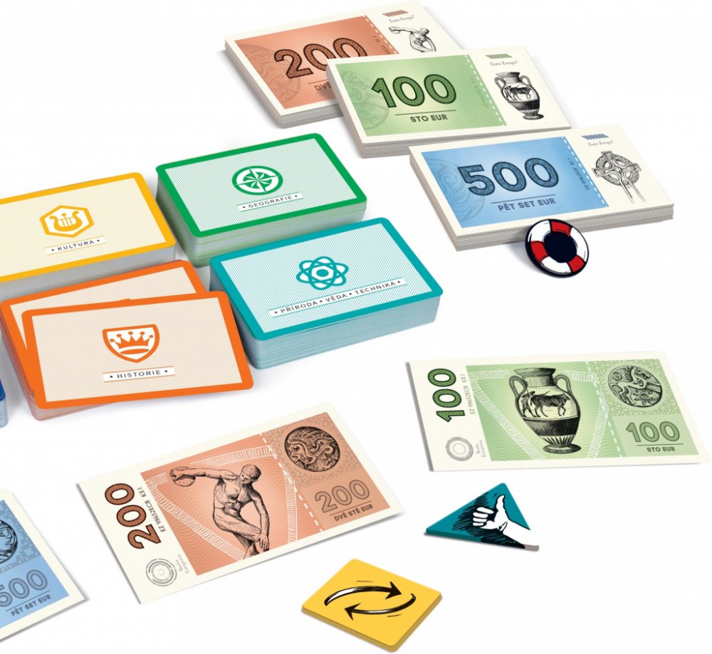 Hra obsahuje: 450 karet s 1350 otázkami, 18 akčních žetonů, bankovky v hodnotě 100, 200 a 500 Euro a pravidla.