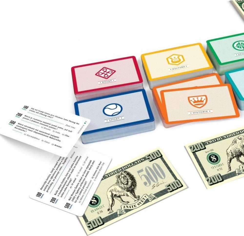 Obsahuje: 450 karet s 1350 otázkami, 18 akčních žetonů, bankovky v hodnotě 100, 200 a 500 dolarů, pravidla