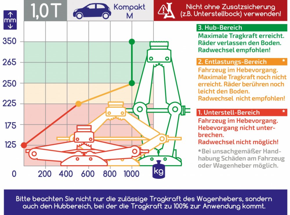 Při použití nůžkových zvedáků mějte na paměti následující: Nůžkové zvedáky jsou v zásadě určeny pro silniční asistenci a zvedání, nikoli pro zvedání. Pravidelná výměna pneumatik by měla být prováděna pouze se zvednutým vozidlem. Tento 1t nůžkový zvedák byl vyvinut pro osobní vozy s výškou prahu 90 mm a více. U vyšších vozidel (výška prahu: 90 - 104 mm) je tento 1,5t nůžkový zvedák bez síly díky své statice, pouze od výšky přes 250 mm. Pokud nastartujete vyšší vozidlo s plným úsilím, dojde k poškození závitu a závitového ložiska.