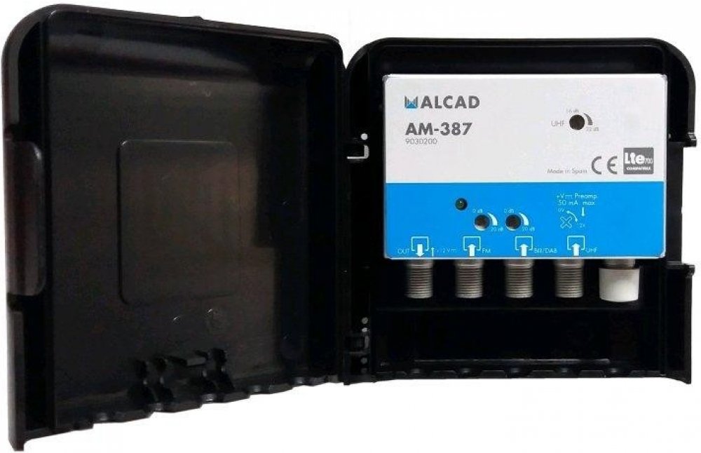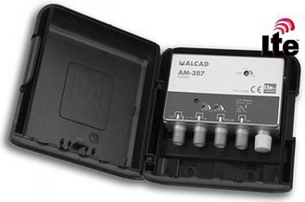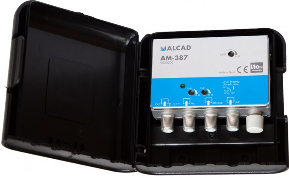 Alcad AM387 je třívstupový stožárový zesilovač v novém vylepšeném designu, zvýšenou odolností proti povětrnostním vlivům a zvýšenou odolností proti rozkmitání. AM387 má potlačené pásmo LTE700 ( má zabudovaný filtr 5G a zesiluje UHF pouze do 694MHz ). Zesilovač je vhodný pro montáž do vnitřního i venkovního prostředí. Jednotlivé vstupy mají samostatnou regulaci zesílení odporovým trimrem, napájení zesilovače +12V je realizováno dálkově po koaxiálním kabelu přes výstup zesilovače, originální napájecí zdroje jsou AL-105 nebo AL-205, které jsou včetně napájecí výhybky a mají v sobě integrován i širokopásmový rozbočovač. Zesilovač je vyráběn SMT technologií a je umístěn v Zamac odlitku, plastový kryt zaručuje zvýšenou ochranu proti povětrnostním podmínkám, plastový kryt zesilovače je přizpůsoben jak k montáži na stožár (pomocí dodávaného třmenu) tak i na stěnu, vstupy a výstupy jsou na F-konektory, u UHF vstupu lze zapnout spínačem napájení pro předzesilovače +12V/50 mA.