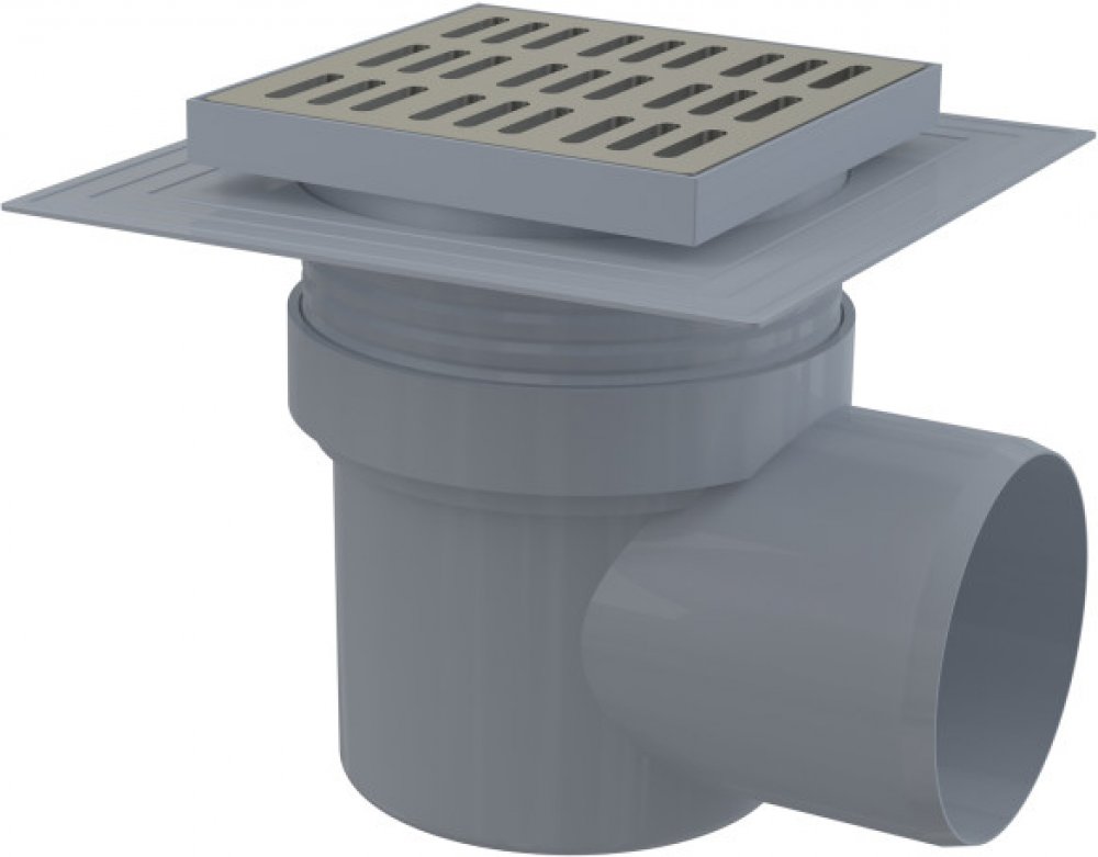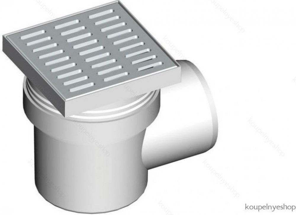 Použití. Pro bezbariérový přístup. Pro odvodnění v úrovni podlahy. Pro vnitřní prostory, kde se předpokládá časté využívání spojené s pravidelným odtokem vody do vpusti (koupelny)..Provedení. Boční napojení na odpad O110 mm. Límec 2. úrovně izolace k napojení hydroizolační vrstvy pod dlažbou. Materiál: nerezová ocel AISI 304, DIN 1.4301. Materiál: polypropylen odolný proti mechanickému, chemickému a tepelnému poškození. Nerezová mřížka 145×145×5 mm. Vodní zápachová uzávěra brání pronikání zápachu z kanalizace. Výškově upravitelné hrdlo 37–57 mm. Vysokokapacitní vpust..Součásti. Hrdlo vpusti 150×150 mm. Límec 2. úrovně izolace O150 mm. Nerezová mřížka. Sada těsnění. Tělo vpusti boční O110 mm. Vodní zápachová uzávěra..