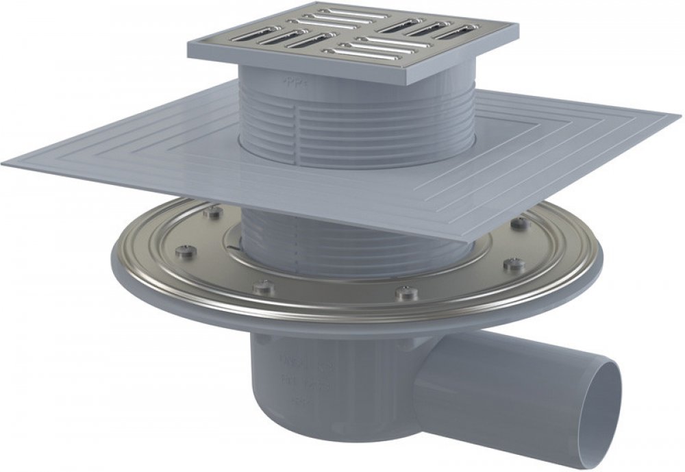 Použití. Pro bezbariérový přístup. Pro odvodnění v úrovni podlahy. Pro vnitřní prostory, kde se neočekává pravidelné využití vpusti (prádelny, kotelny, sklepy)..Provedení. Boční napojení na odpad O50 mm. Kombinovaná zápachová uzávěra SMART. Kompatibilita s dílci podlahových vpustí včetně vodní, suché a kombinované zápachové uzávěry SMART. Límec 2. úrovně izolace k napojení hydroizolační vrstvy pod dlažbou. Materiál: nerezová ocel AISI 304, DIN 1.4301. Materiál: polypropylen odolný proti mechanickému, chemickému a tepelnému poškození. Mechanicky čistitelný sifon až po odpadní trubku. Nerezová mřížka 102×102×5 mm. Nerezový límec pro pevné přichycení hydroizolační fólie nebo tkaniny hydroizolace stavby. Široký izolační límec pro napojení na hydroizolaci stavby. Vodní sloupec a mechanická klapka účinněji zabraňují pronikání zápachu z kanalizace. Výškově upravitelné hrdlo 25–95 mm..Součásti. Hrdlo vpusti 105×105 mm. Kombinovaná zápachová uzávěra SMART. Límec 2. úrovně izolace vnitřní O105 mm. Nerezová mřížka. Nerezová příruba + montážní set. Sada těsnění. Tělo vpusti boční O50 mm..