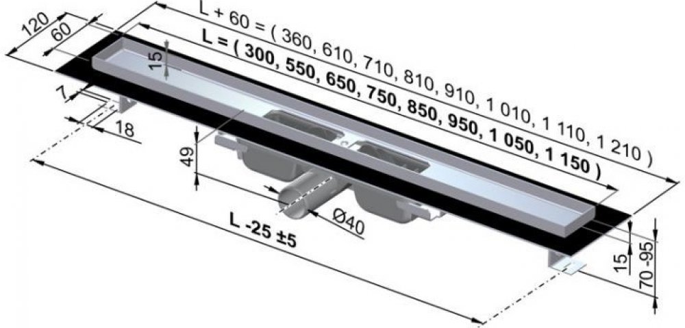 Alcadrain nerezové stříbrné sprchové žlaby 1050 mm 100 mm 35 l/min