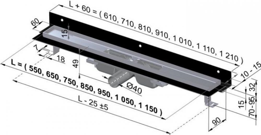 Součástí balení: žlab smontovaný se sifonem, podlahový žlab s okrajem pro perforovaný rošt a s nastavitelným límcem ke stěně, kotvící set (vrut Ø6x50 - 2 ks, hmoždinka Ø10 - 2 ks, vrut Ø4,2x38 - 3 ks, hmoždinka Ø8 - 3 ks), samolepicí hydroizolační páska, ochranná fólie límce žlabu a vtoku do sifonu, instalační kryt koryta, fixační materiál pro uchycení stavitelných noh (šroub M6x12 - 2 ks).