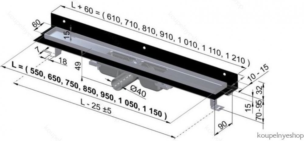 ALCAPLAST Flexible Low Podlahový žlab s okrajem pro perforovaný rošt APZ104-950 - s nastavitelným límcem ke stěně Délka žlabu: 950 mm Minimální tloušťka betonu: 55 mm Celková stavební výška: 70-96 mm Šířka koryta žlabu: 60 mm Maximální tloušťka dlažby: 12 mm Průtok žlabu (ČSN EN 1253): 35 l/min Odpadní potrubí: průměr 40 Posun límce: 10–15 mm Třída zatížení (ČSN EN 1253): K3 Materiál – tělo žlabu (ČSN 17240): nerezová ocel DIN 1.4301 materiál – zápachová uzávěra: PP Tento žlab je určen pro vkládání perforovaných roštů. Nerezový okraj tvoří pohledový přechod mezi dlažbou a vloženým roštem. Voda vtéká do žlabu přes okraje a otvory v roštu. Umísťuje se přímo ke stěně. Nastavitelný vertikální límec umožňuje jednoduchou instalaci a dokonalou izolaci při různých tloušťkách obkladů stěn sprchového koutu. Nastavitelný vertikální límec Žlab APZ4 a APZ104 Low je určen pro instalaci přímo ke stěně sprchového koutu. Vertikální izolační límec je nastavitelný pro jakýkoliv obklad stěny v tloušťce od 6–12 mm. Rozdíl v tloušťkách obkladů se proto nemusí vyrovnávat vrstvou lepidla. Na rozdíl od ostatních liniových žlabů jsou žlaby Flexible přichyceny nejenom do podlahy, ale také přes vertikální límec do stěny sprchového koutu. Následně je límec překryt hydroizolací a obkladem stěny. Žlab tím získá lepší schopnost odizolovat prostor od vlhkosti. Také spádování koupelny ke stěně je snazší. Výhody žlabů ALCA - dokonale čistitelný sifon - nízká stavební výška (70 mm) - komplexní nabídka technického a designového řešení - nadstandardní příslušenství - 25 let záruka Záruky Společnost Alca plast s.r.o. poskytuje zákonné i prodloužené záruční lhůty. Odbornou a profesionální montáží můžete výrazně ovlivnit funkčnost, užitnou hodnotu výrobku a tím samozřejmě spokojenost uživatele s daným produktem. Na výrobky Alca plast, nainstalované certifikovaným instalatérem, poskytuje firma rozšířenou záruční lhůtu.