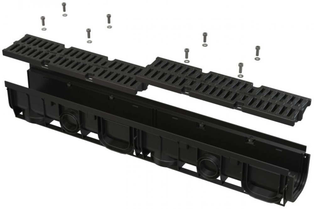 Rošt plastový – fixovaný ve žlabu pomocí osmi kusů nerezových šroubů, šířka vtokové štěrbiny 14 mm