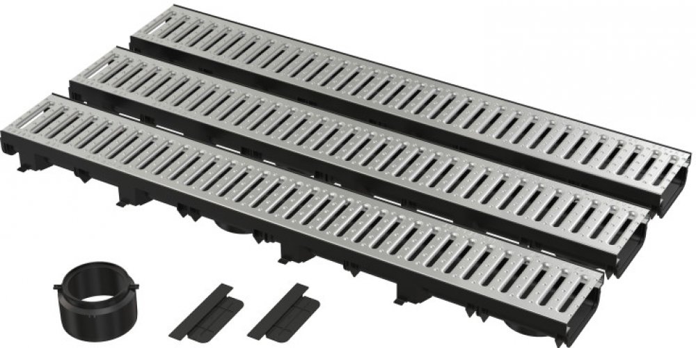 Použití. Pro odvodnění ploch s občasným pojezdem osobních automobilů, chodníky, pěší zóny a podobné plochy pro osobní automobily..Provedení. Aretace roštů bez použití šroubů. Jednoduché rozdělení žlabu na dvě stejně dlouhé poloviny. Materiál s UV stabilizátorem proti stárnutí, blednutí a degradaci plastu. Materiál: polypropylen plněný mastkem odolný proti mechanickému, chemickému a tepelnému poškození. Pozinkovaný rošt s „T“ profilem, šířka vtokové štěrbiny 9 mm. Propracovaný a pevný zámkový mechanismus pro jednoduché spojování jednotlivých žlabů. Snadný přístup do žlabu - jednoduchá čistitelnost. Svislé napojení na odpad O110 mm. Systém zámků dovoluje snadné napojování bez nutnosti dalších prvků..Součásti. Čelo 2 ks. Fixační vrut 3,5×13 – 2 ks. Hrdlo. Nízká hmotnost, vysoká pevnost. Pozinkovaný rošt profilu „T“ 3 ks – třída zatížení A15. Tělo žlabu s plastovým rámem 3 ks..