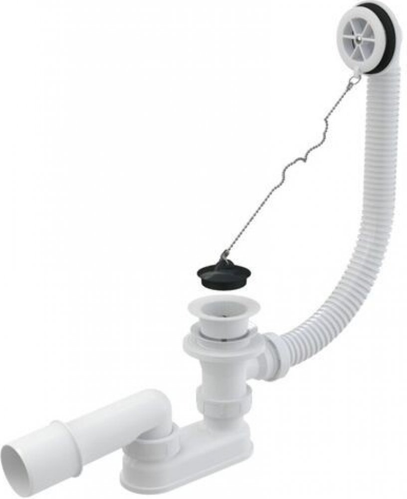Alcadrain sifon vanový bílý, pro vany standardních rozměrů, s otvorem Ø 5,2 cm, materiál polypropylen, délka 57 cm, krytky chrom, zavírání pomocí zátky, zápachová uzávěrka 5 cm, odolnost zápachové uzávěrky 588 Pa, průtok 43 l/min, napojení na odpad Ø 5 cm.