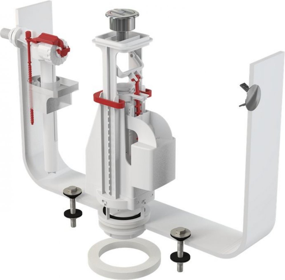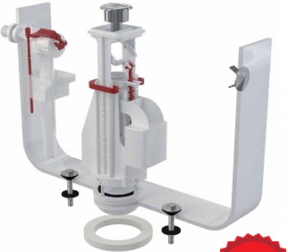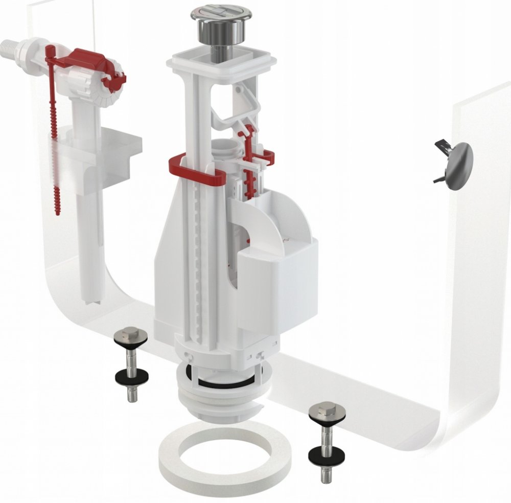 Použití. Pro keramické splachovací nádržky. Pro výměnu nebo náhradu..Provedení. Clona pro nastavení množství vypouštěné vody. Konstrukce umožňuje seřízení optimální výšky ventilu dle výšky nádržky. Malá citlivost na rozdíl tlaku ve vodovodním řádu. Možnost nastavení tlačítka mimo osu ventilu. Nastavitelná výška vodní hladiny. Plastový závit délka 38 mm. Plynulé uzavření bez rázů. Tlačítko DUAL pochromované. Vypouštěcí mechanismus DUAL 3/6 l. Zabudované sítko pro zachycení nečistot..Součásti. Fixační set: šroub M8×65 – 2 ks. Napouštěcí ventil A15-3/8". Sada těsnění. Vypouštěcí ventil A08A. Záslepka chrom..