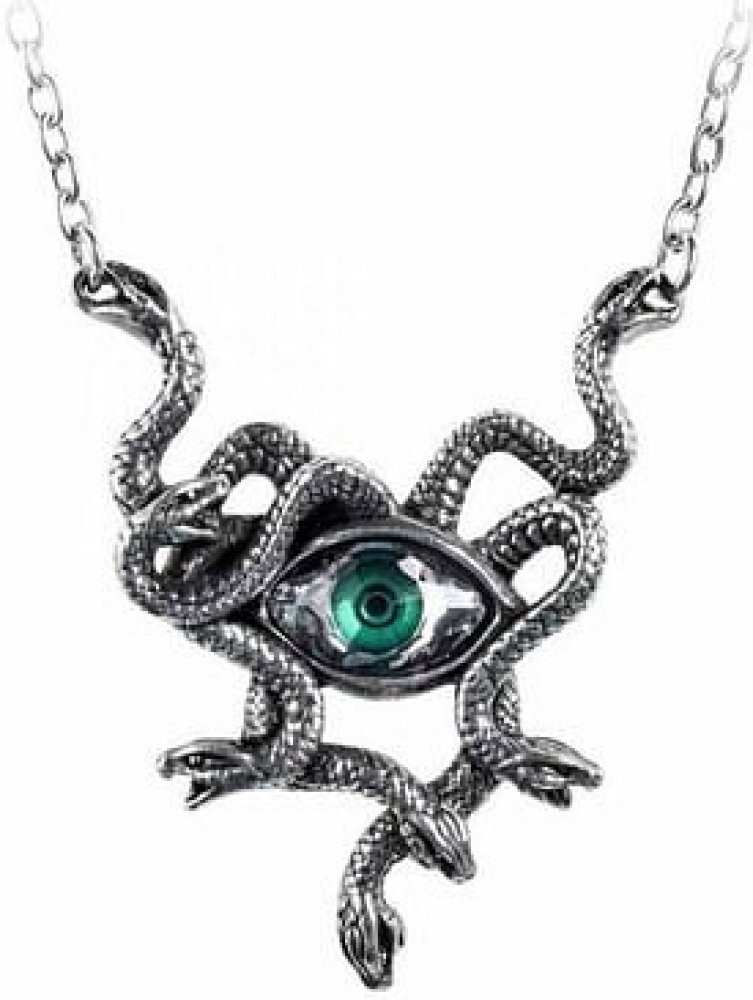 Náhrdelník tvoří masivní řetízek, na kterém je zavěšen přívěsek ve tvaru strašlivého oka jedné z Gorgon. Zelené oko hledí skrze svíjející se hady. Ušlechtilá patina zdobí jemně opracovaný povrch, střed tvoří smaragdově zelený krystal Swarovski. Buďte opatrní a nedívejte se do oka příliš dlouho! Jistě víte, co dokázala mocná Medusa...