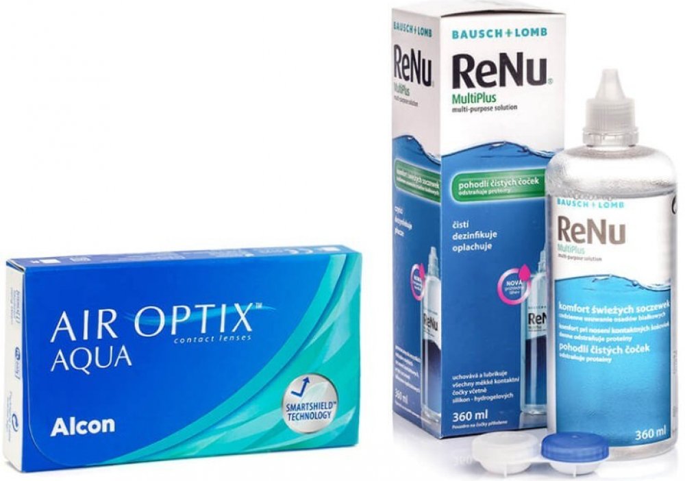 Měsíční kontaktní čočky Air Optix Aqua nabízíme ve zvýhodněném balíčku s roztokem ReNu MultiPlus 360 ml. Air Optix Aqua jsou silikon-hydrogelové kontaktní čočky od společnosti Alcon určené pro denní nošení s měsíční výměnou. Čočky Air Optix Aqua nabízí všechny výhody silikon-hydrogelového materiálu v kombinaci s vyšším obsahem vody, s vysokou propustností pro kyslík a s vylepšenou odolností vůči vytváření usazenin. Vysoká propustnost kyslíku dovoluje i příležitostné přespání (maximálně 6 nocí). Prodloužený způsob nošení čoček Air Optix Aqua by však měl doporučit kontaktolog. Čočky Air Optix Aqua jsou odolnější proti tvorbě bílkovinných usazenin. Povrch čoček je ošetřen speciální plazmatickou úpravou, která jej činí rezistentní vůči ukládání depozit. Roztok ReNu MultiPlus 360 ml od společnosti Bausch & Lomb je víceúčelový roztok s Hydranátem, určený pro kompletní péči o všechny druhy měkkých kontaktních čoček. Tento víceúčelový roztok oplachuje, dezinfikuje a zároveň čočky hydratuje a odstraňuje usazené proteiny a lipidy obsažené v slzách. Ve složení tohoto roztoku je i kyselina boritá, která vyrovnává narušené pH na kontaktních čočkách. Látka Poloxamine odstraňuje vnější zbytky buněčných tkání.