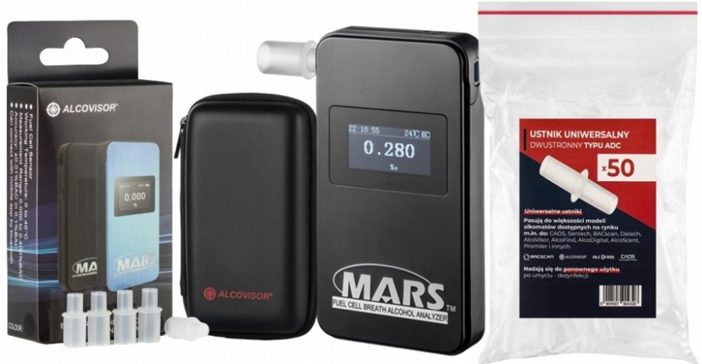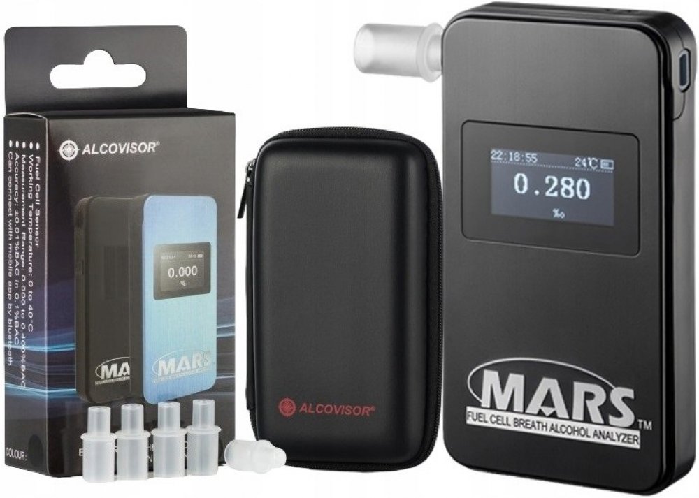 Alkohol tester Alcovisor Mars BT ( Bluetooth ) je novinkou 2016 mezi alkohol testery na Českém trhu ! Tento alkohol tester disponuje Bluetooth modulem , což vám umožňuje ho snadno spárovat s vaším mobilním telefonem pomocí speciální aplikace a jednoduše ho ovládat , nastavovat si různé parametry a prohlížet si historii všech měření . Tato aplikacia je dostupná pro Android tak i pro iPhone . Tester je vybaven kvalitním elektrochemickým senzor ( FUEL CELL ) co zajistit maximální přesnost a spolehlivost . Alkohol tester Alcovisor Mars je připraven na měření během tří sekund a pokud výsledek měření překročí přednastavenou hranici alkoholu , upozorní Vás vizuální i zvukový alarm . Základní vlastnosti: Doporučený počet měření za týden: 25 Doporučená doba kalibrace: po 6 měsících Soubory ke stažení: Protokol o provedení dechové zkoušky