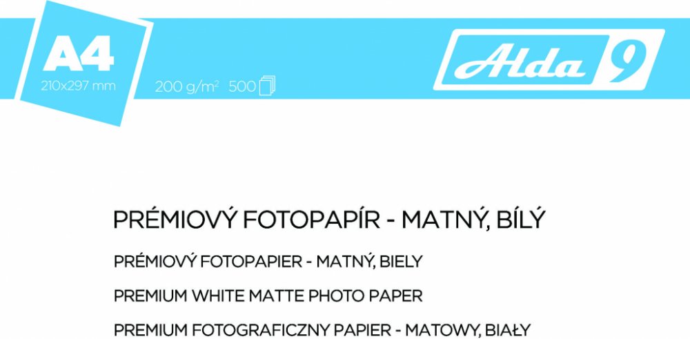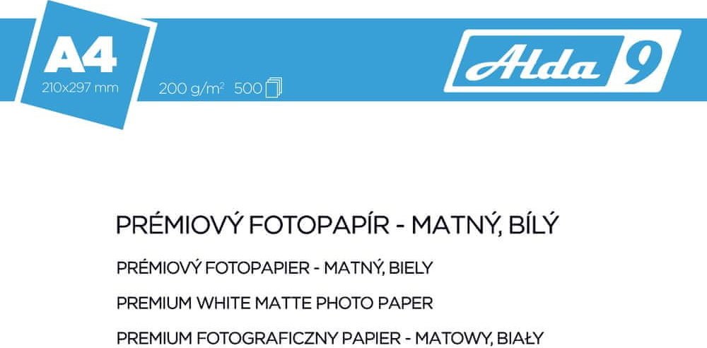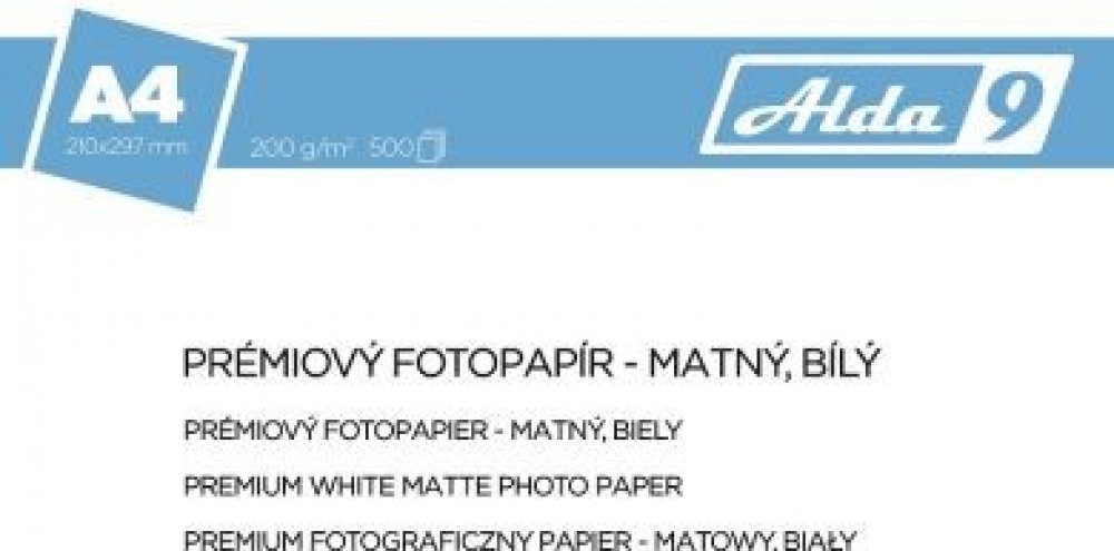 Fotopapír A4 Premium matný (500 listů), 200g/m2. Speciální premium matný fotografický papír. Nejkvalitnější fotografický papír vhodný pro zvláštní příležitosti a vzácné vzpomínky. Při použití papírů ALDA9 dosáhnete nepřekonatelných výsledků při tisku doma, v kanceláři i v profesionálním studiu. •Velikost papíru: A4