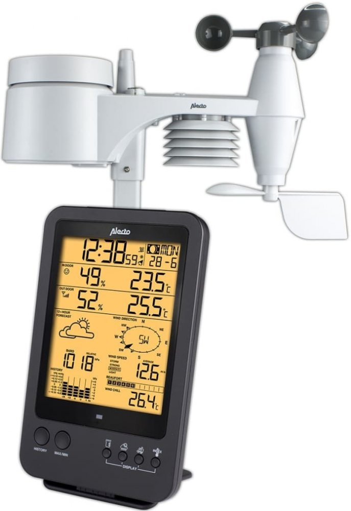 Tato profesionální bezdrátová meteostanice WS-4700 je ideálním zařízením pro předpověď počasí a pro použití jako budík. S touto meteostanicí můžete na první pohled zkontrolovat datum, čas a předpověď počasí.Díky bezdrátovému venkovnímu čidlu měří tato meteostanice vnitřní i venkovní teplotu a vlhkost, srážky a rychlost větru. Můžete ji také použít k nastavení varování před příliš vysokými nebo příliš nízkými teplotami. Nabízí animovanou předpověď počasí (slunečno, mírně oblačno, zataženo a déšť). Teplotu lze zobrazit ve °C nebo °F. Má dosah až 100 metrů bez překážek.Toto zařízení lze použít také jako budík se zobrazením času a data. Současně se zobrazují následující naměřené hodnoty: Zobrazení času, data, fáze měsíce, animované předpovědi počasí, zobrazení komfortu, barometrického tlaku nebo srážek, směru a rychlosti větru, vnitřní a venkovní vlhkosti, vnitřní a venkovní teploty a chladného větru. Zobrazovací jednotku lze umístit na stůl nebo připevnit na stěnu. Bezdrátové a digitální zařízení se snadno instaluje (bez kabelů) a je snadno čitelné.Tato meteorologická stanice vyžaduje tři baterie AA 1,5 V pro vnitřní jednotku, tři baterie AA 1,5 V pro venkovní čidlo (jsou součástí dodávky).Barva: černáMateriál: PVC a ALURozměry: 2 x 12 x 19 cm (D x Š x V)S teploměrem, vlhkoměrem, srážkoměrem a anemometrem (rychlost větru)S bezdrátovým venkovním čidlem (868 MHz) na robustním sloupkuMěří vnitřní a venkovní teplotu a vlhkost, srážky a rychlost větruChladný vítr a rosný bodIndex teplaVarování před mrazemZobrazení teploty ve °C nebo °FÚdaje o srážkách za hodinu, 24 hodin, týden a měsícZobrazení minimální a maximální teplotyAnimovaná předpověď počasí, slunečno, mírně oblačno, zataženo a déšťRádiem řízené hodiny se zobrazením dataNastavitelné časové pásmoFáze měsíceBudík s funkcí opakovaného buzeníUpozornění na příliš vysokou nebo příliš nízkou teplotuPaměť pro minimální a maximální hodnotuPodsvícený displejDisplej lze umístit na stůl nebo připevnit na stěnuIndikátor slabé baterie a indikátor mimo dosahDosah: až 100 metrů (bez překážek)Současné zobrazení času, data, fáze měsíce, animované předpovědi počasí, zobrazení komfortu, barometrického tlaku nebo srážek, směru a rychlosti větru, vnitřní a venkovní vlhkosti, vnitřní a venkovní teploty a chladného větruBaterie:Vnitřní jednotka: 3 x 1,5 V baterie AA (nejsou součástí dodávky)Venkovní jednotka: 3 x 1,5 V baterie AA (není součástí dodávky) Meteostanice pro profesionály s mnoha funkcemi Hledáte komplexní a přesnou meteostanici pro profesionály? Pak je naše stanice WS-4700 vynikající volbou. Můžete si přečíst všechny druhy informací o počasí a předpovědi počasí, zatímco na přehledném displeji se současně zobrazují následující údaje: čas, datum, fáze měsíce, animovaná předpověď počasí, komfort, tlak vzduchu nebo množství srážek, směr větru, rychlost větru, vnitřní vlhkost, venkovní vlhkost, vnitřní teplota, venkovní teplota a chlad větru. Stručně řečeno, budete dobře informováni. Robustní a přesná meteorologická stanice Bezdrátové venkovní senzory de 868 MHz jsou namontovány na velmi robustním stožáru. Stejně jako všechny výrobky Alecto je i tato meteorologická stanice vysoce kvalitní za atraktivní cenu. Spousta informací de aa meteostanice Jak přesné chcete mít informace, pokud jde o todas počasí? Díky následujícím možnostem můžete získat podrobný obraz o tom, jak se bude počasí vyvíjet v blízké budoucnosti. Myslete na velmi konkrétní opatření, jako např: - De rosný bod, index de tepla a výstraha de mrazu - údaje de srážek za hodinu, za 24 hod, za týden nebo za měsíc - Má také paměť pro minimální a maximální teplotu (kterou si můžete zapamatovat) de minimální a maximální teplotu (kterou si sami určíte) a alarm v případě překročení jedné z těchto hodnot Mysleli jsme také na jednoduchost používání, jako je unaa funkce de alarm con snooze a una upozornění, když je baterie téměř vybitá nebo jste mimo dosah stožáru. Mimochodem, že dosah 100 metrů ve venkovním prostředí. V neposlední řadě je zobrazovací jednotka vhodná pro montáž na stůl i na stěnu. Profesionální meteorologická stanice s měřením teploty (vnitřní a venkovní), vlhkosti (vnitřní a venkovní), tlaku vzduchu, srážek, rychlosti a směru větru. Naměřené hodnoty jsou bezdrátově přenášeny do základní stanice. Funkce: - Přehledný 5,5" (14 cm) podsvícený displej - Bezdrátový venkovní senzor (dosah: až 30 metrů) - Vypočítává pocitovou teplotu, tepelný index a rosný bod - Alarm teploty, vlhkosti, rychlosti větru a deště - Ukládá nejnižší a nejvyšší naměřené hodnoty - Animovaná předpověď počasí se snadno čitelnými symboly - Zobrazuje fáze měsíce - Vždy ukazuje správný čas (rádiem řízené hodiny) Technická data: - Rozsah měření venkovní teploty: -40....+80 °C (-40...+176 °F) - Rozsah měření vnitřní teploty: -40...+70 °C (-40...+158 °F) - Rozsah měření vnitřní vlhkosti: 20...90 % rH - Rozsah měření venkovní vlhkosti: 1....99 % rH - Rozsah měření tlaku vzduchu: 540...1100 hPa - Rozsah měření rychlosti větru: 0...112 mph, 50 m/s, 180 km/h, 97 uzlů - Počet směrů větru: 16 - Rozsah měření srážek: 0...9999 mm (0...393,7 palců) - Dosah: 30 m - Přenosová frekvence: 868 MHz - Barva: rozměry meteostanice: 120x190x22 mm - Rozměry venkovní jednotky: 343,5x393x5x136 mm Rozsah dodávky: - meteostanice - venkovní jednotka - 6x baterie AA - návod k obsluze