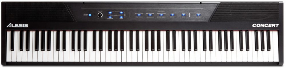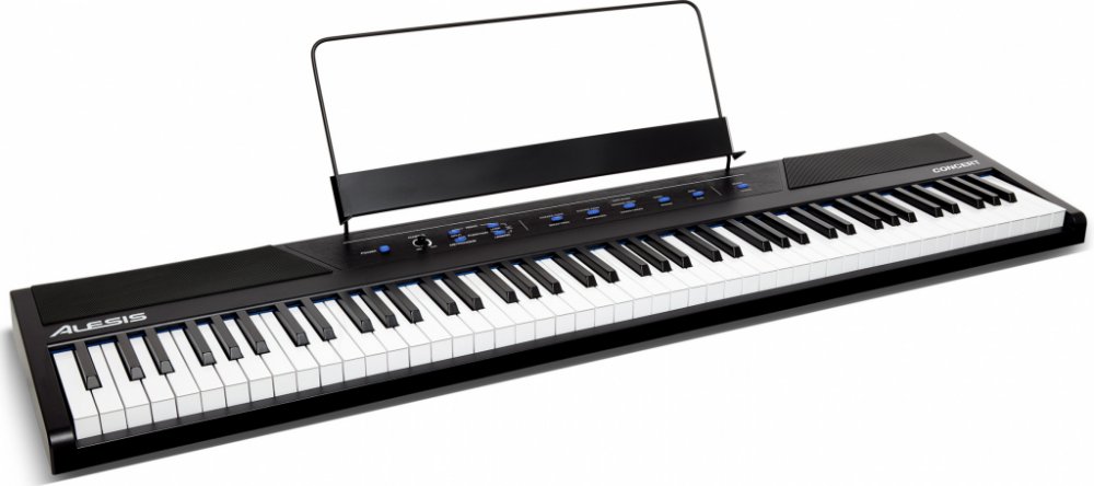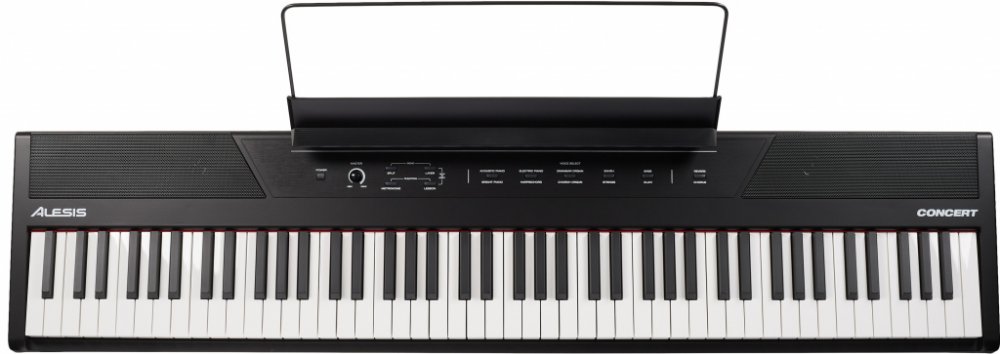 Přenosné digitální stage piano Alesis Concert je nové digitální piano s polovyváženou klaviaturou a nastavitelnou silou úhozu. Piano disponuje deseti zvuky zahrnující klasická piana, elektrická piana, smyčce, basu, nebo varhany. Dále obsahuje funkci Split pro rozdělení klaviatury, tzn. že každou rukou hrajete jiným zvukem, nebo integrované efekty Reverb a Chorus studiové kvality s množností nastavení parametrů. Piano Concert je vhodné pro pokročilé i začínající klavíristy, obsahuje výukový mód, který vám rozdělí klaviaturu na dvě stejné sekce (tónina a zvuk), takže učitel a žák můžou hrát společně na jednom nástroji. Samozřejmostí je potom integrovaný metronom, RCA výstup do PA systému nebo mixpultu, sluchátkový výstup pro „silent mode“, reproduktory s výkonem až 20 W, nebo USB port pro připojení do PC či laptopu. Součástí balení je sustain pedál, napájecí adaptér, notový stojan, tříměsíční licence na Skoove Premium – vzdělávací hudební aplikace a dvouměsíční předplatné video lekcí na TakeLessons.