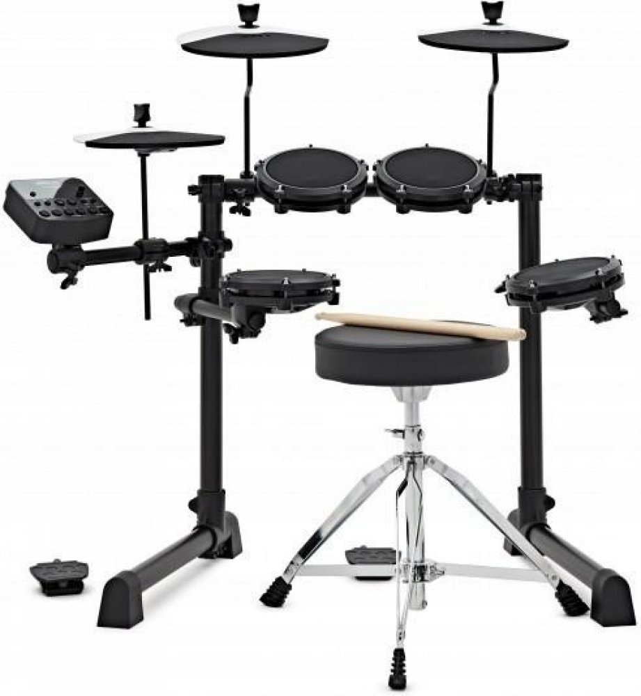 Hra na bubny nebyla nikdy dostupnější! Představujeme Debut Kit od Alesis, kompletní elektronický bubenický systém v jedné krabici. Debut Kit je dodáván se vším, co potřebujete, abyste mohli ihned začít bubnovat. Set obsahuje čtyři 6 "nastavitelné pady se síťovou blánou, které jsou mnohem méně hlučné než gumové pady a hra na ně je realističtější. Každý z 3 zahrnutých činelů se může pochlubit velkou 10-palcovou hrací plochou, takže vám nikdy neunikne žádný úder. KickPad a Hi-Hat se ovládají pomocí citlivých nožních pedálů, které se dají jednoduše sbalit a odložit, když se nepoužívají. Nastavitelná židle a sluchátka poskytují pohodlí hráčům všech věkových skupin. V balení jsou zahrnuty i paličky. Debut Kit je ideálním setem pro každého začínajícího bubeníka.Srdcem Debut Kit je zvukový modul nabitý funkcemi. Obsahuje 10 klasických a moderně znějících bicích sad, navržených na míru firmou Alesis. Tyto sady obsahují 120 samostatných zvuků bicích a využívají technologii Intelligent Dynamic Articulation ™ k zajištění neuvěřitelně realistického zvuku a hratelnosti. Zvukový modul lze připojit k externímu zvukovému systému nebo zesilovači, jako je například Alesis Strike Amp 8 (prodává se samostatně), pomocí stereofonních ¼ "výstupů, nebo můžete připojit sluchátka pro skutečně tiché a soukromé cvičení. Zvukový modul Debut Kit také je vybaven integrovaným bubnovým trenérem včetně 30 play along skladeb a speciálně navrženými rytmickými cvičeními, které pomáhají budovat a zdokonalovat vaše schopnosti. Navíc je zde aux vstup, který vám umožní jammování s vašimi oblíbenými melodiemi z telefonu nebo tabletu.Rozměry d x š x v: 59,9 x 89,9 x 95 centimetrů