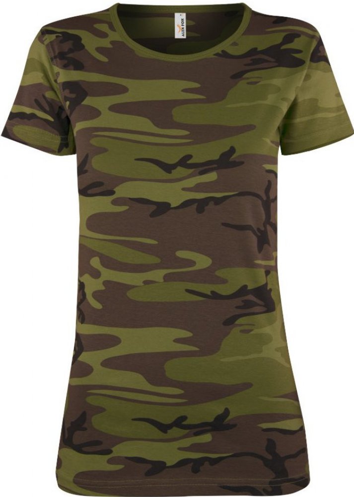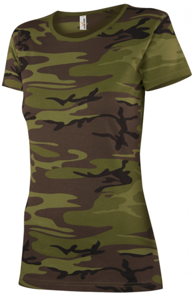 Dámské bavlněné tričko s army vzorem tmavě zeleného maskáče s krátkým rukávem. Tričko má kulatý střih okolo krku a vyštíhlený a prodloužený střih s krátkým hlavicovým rukávem. Tričko je vyrobeno ze 100% česané bavlny v gramáži 155 g/m2 s trvanlivým potiskem a silikonovou úpravou zajišťující příjemný pocit při nošení. Hodí se pro zejména pro outdoorové aktivity, do lesa, na ryby i posezení při tábo...