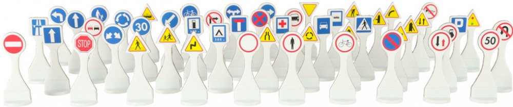 Balení obsahuje: 50 dopravních značek výšky 5cm, 50 plastových podstavců, český a slovenský návod s popisem významů značek.