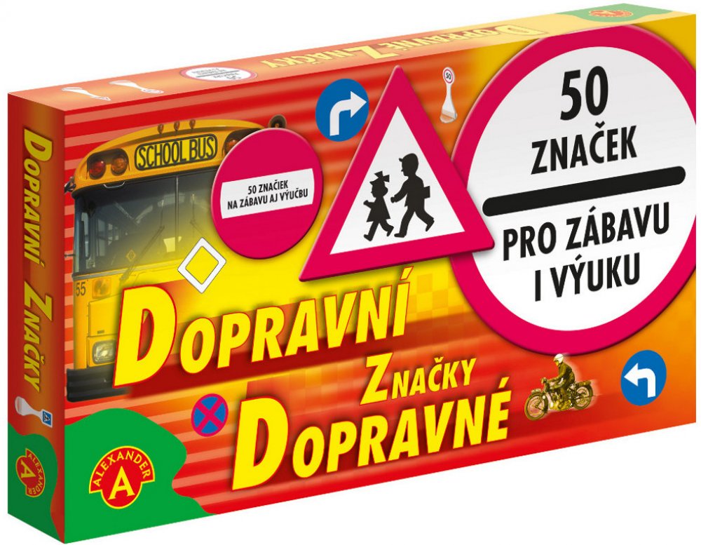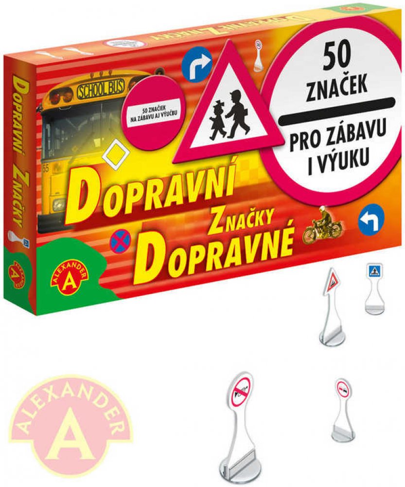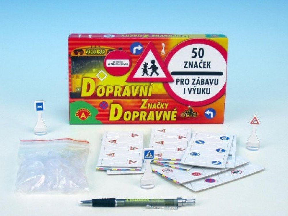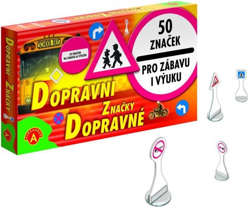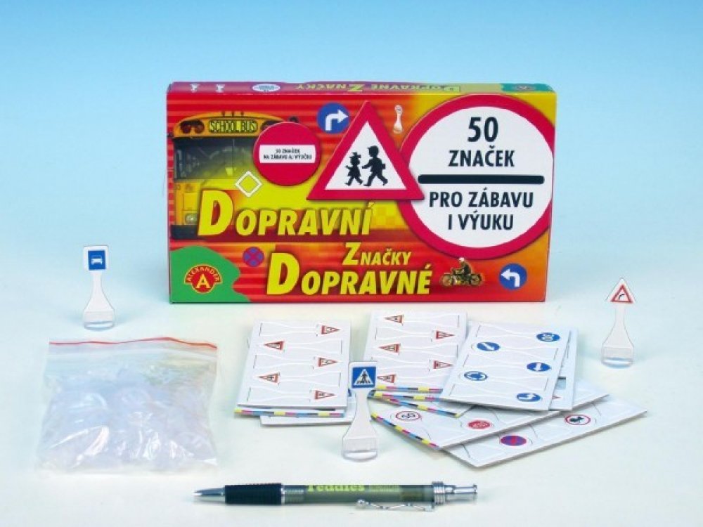Děti se učí poznávat nejznámější dopravní značky. Balení obsahuje 50ks dopravních značek z pevného lesklého kartonu o výšce 5 cm a 50ks plastových stojánků a český a slovenský popis značek.
