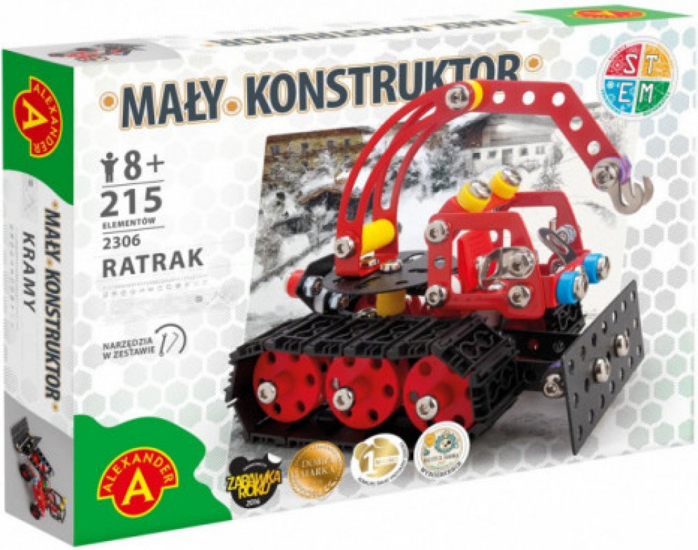 Malý konstruktér - Ratrak Malý konstruktér je řada hraček pro samostatné sestavování, rozvíjení manuální zručnosti a prostorové představivosti. Každý model se skládá z kovových prvků různých velikostí a tvarů a je obohacen barevnými plastovými prvky. S přiloženou sadou nářadí si můžete postavit jedinečné vozidlo podle návodu nebo podle vlastní fantazie. Po sestavení je model odolný a lze jej volně používat k dalším hrám. Jedná se o ideální úvod, který ve vašem dítěti zažehne vášeň pro inženýrství. Je to hračka, která spojuje generace a podporuje společné kutilství..