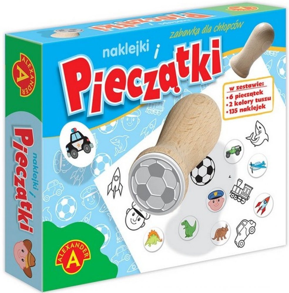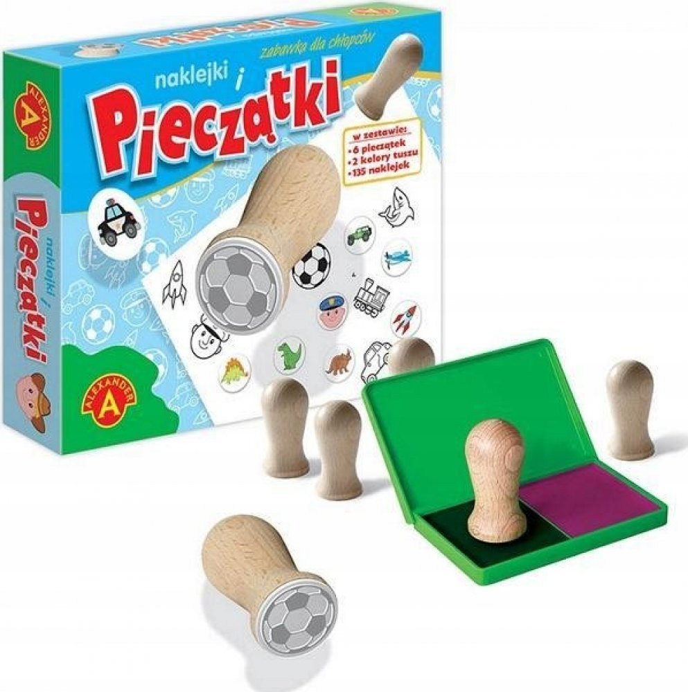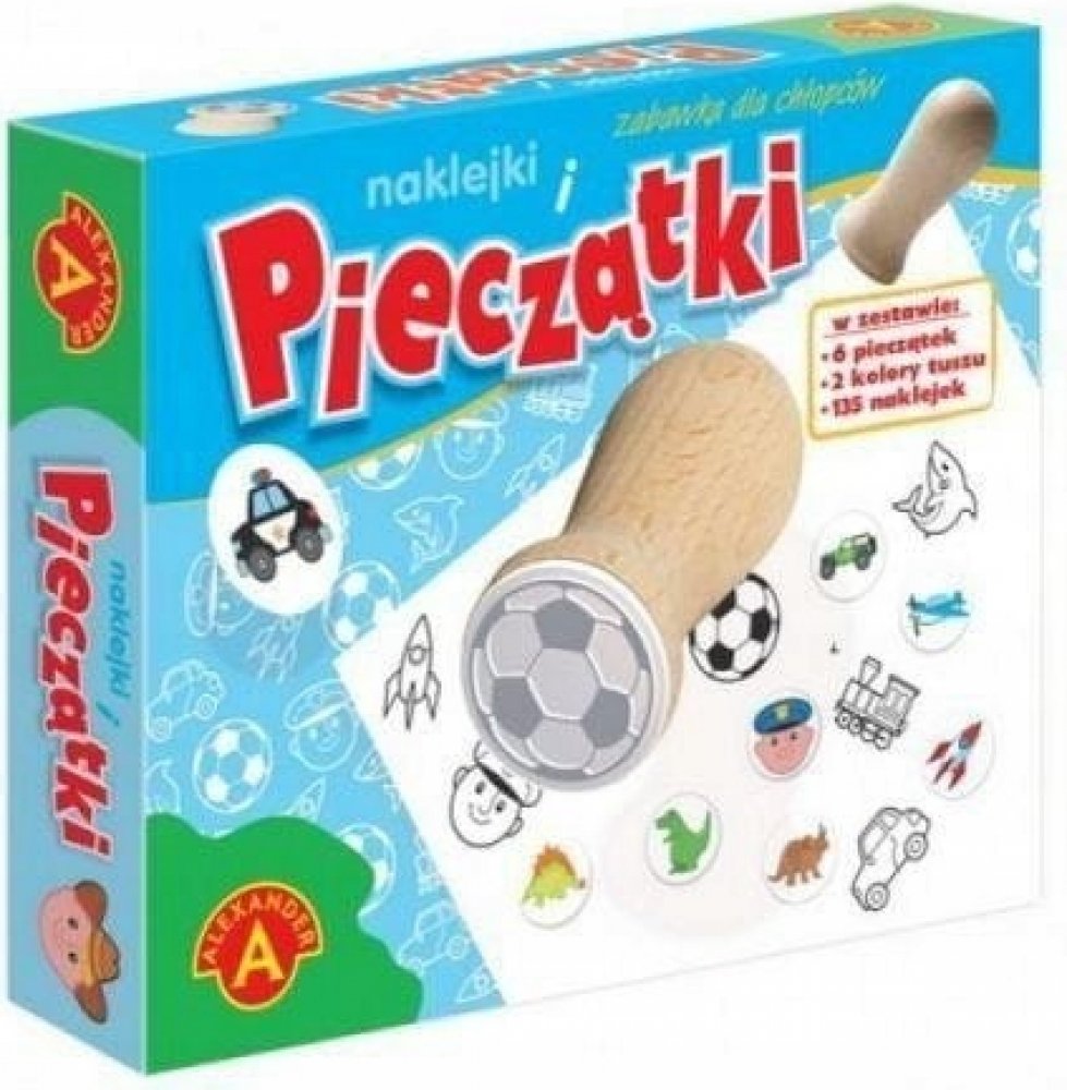 Kreativní sada pro děti skládající se ze 6 razítek s oblíbenými motivy chlapců (míč, policista, autíčko, raketa, vlak, žralok), která lze odrážet na kartě černým a červeným inkoustem z polštářků umístěných ve speciální plastové krabičce. Odražené tvary lze vybarvovat pastelkami nebo jimi navíc zdobit své kresby. 135 barevných samolepek zpestřuje zábavu. Všechny prvky jsou umístěny v elegantním, funkčním lisu. 100% polský výrobek vyráběný výhradně v továrně Alexandra.