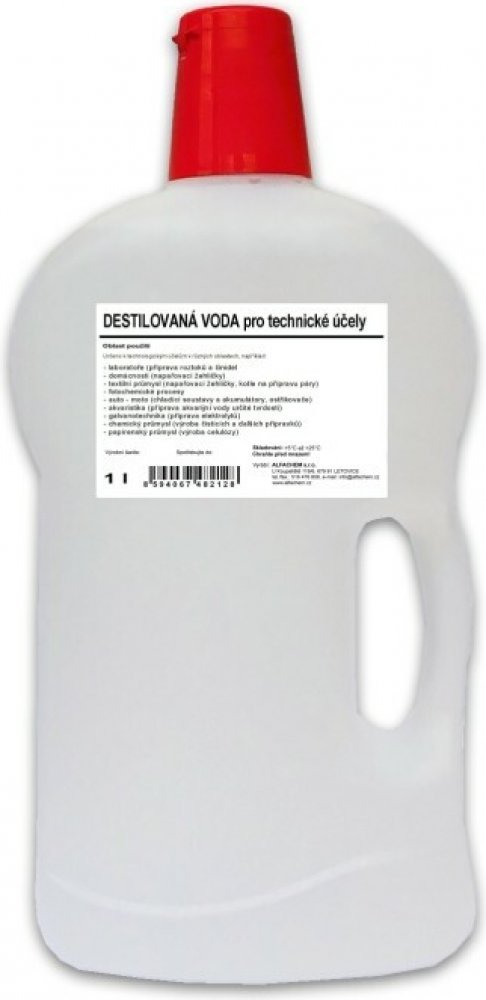 Destilovaná voda pro technické účely - k ředění kapalin v domácnostech i pro průmyslové použití. Čirá kapalina bez barvy, chuti a zápachu. Od obdobných přípravků se odlišuje výrazně nízkou měrnou elektrickou vodivostí. Je určena k technologickým účelům, například: laboratoře (příprava roztoků a činidel) domácnosti (napařovací žehličky, zvlhčovače vzduchu) textilní průmysl (napařovací žehličky, k...