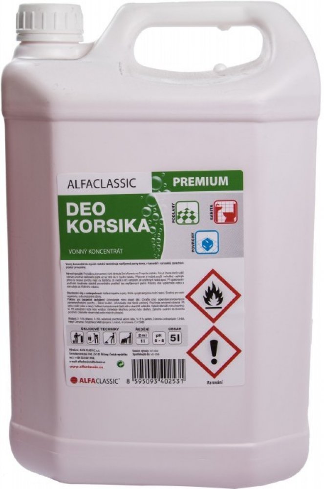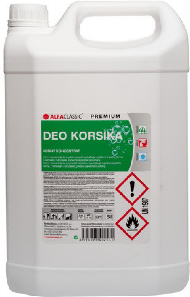 ALFA CLASSIC PREMIUM Vonný koncentrát do mycích roztoků, který neutralizuje nepříjemné pachy doma, v kanceláři i na toaletě a zanechává prostor provoněný. Produktový list 125452_P1EA00_DEO KORSIKA.pdf Datový list 125452_D1EA00_DEO Korsika 5l.pdf