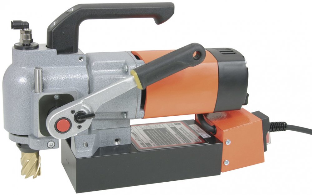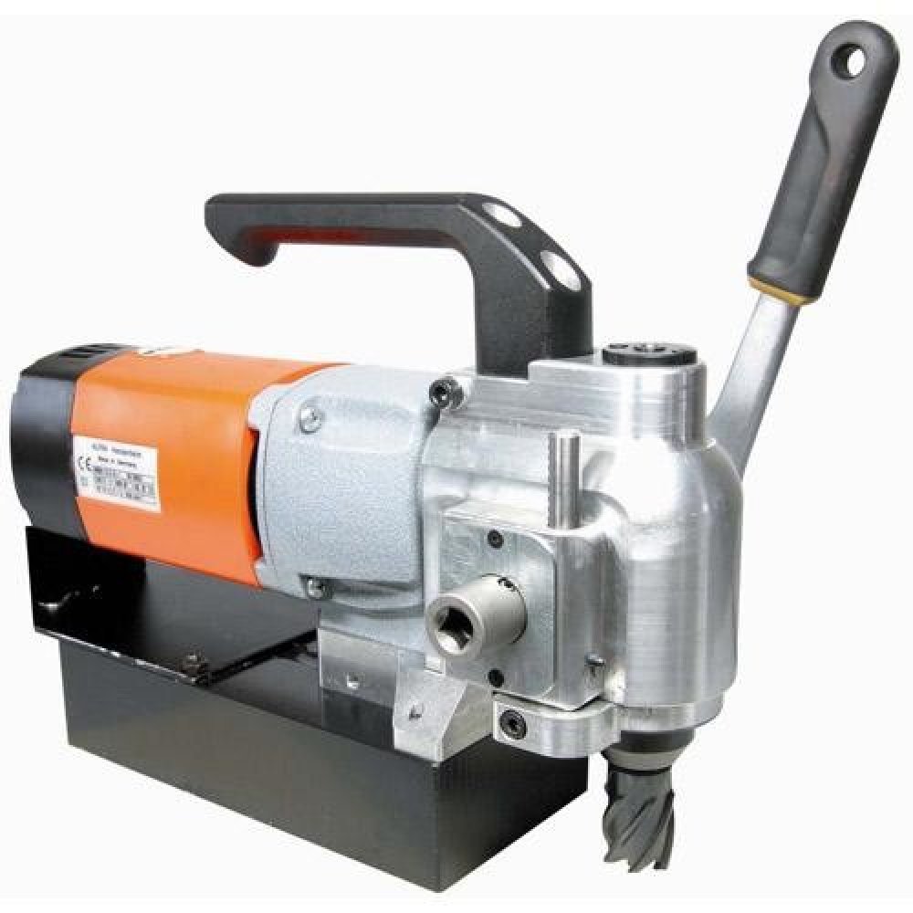 MAGNETICKÁ VRTAČKA ROTABEST V32 Vrtačka s nízkým provedením vyvinutá zejména pro práce ve stísněných podmínkách. Vrtání v nízkých profilech šasi dopravních prostředků, speciálních nástaveb, mostních konstrukcí a podobně komplikovaných prostorách. Podle potřeby lze páku posuvu instalovat z levé i pravé strany stroje. Tlakový chladící systém zajistí přívod chladící kapaliny přímo do místa vrtání. vrtání do průměru 32 mm pravolevá pozice páky posuvu ultranízké provedení stavební výška 227 mm (po demontáži rukojeti jen 185 mm) Součást balení: magnetická vrtačka V 32 transportní kufr bezpečnostní zajišťovací pás tlakový chladicí systém nářadí pro obsluhu návod na obsluhu