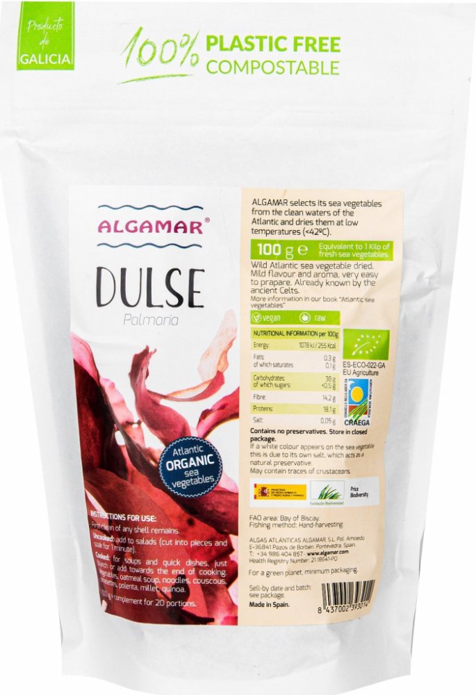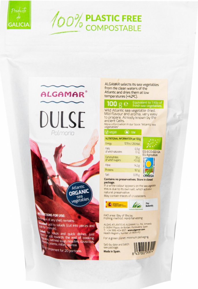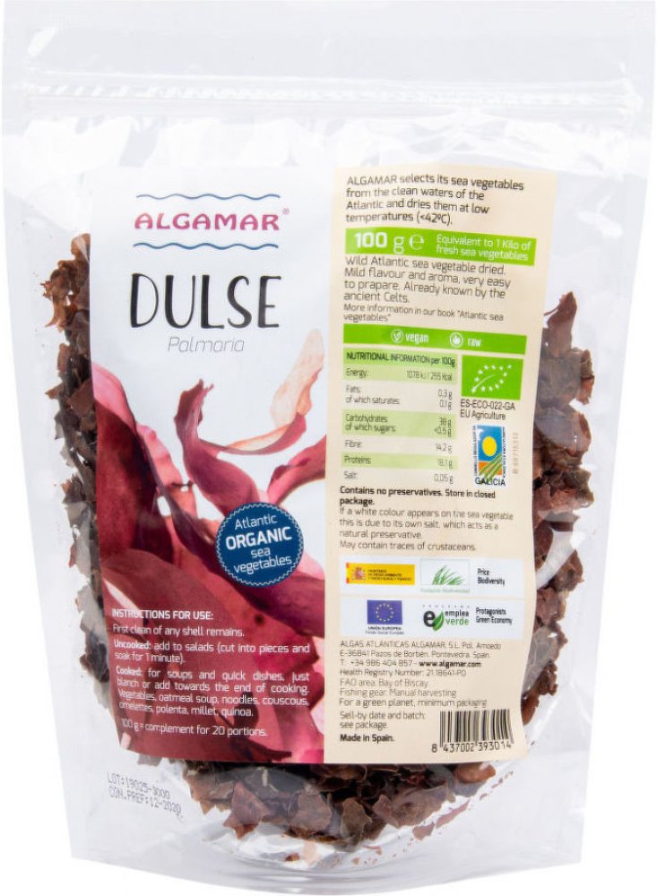 Mořské řasy Dulse v biokvalitě. Mají jemnou chuť a aroma, jsou přirozeně bezlepkové a vhodné pro vegany. Jejich příprava je snadná. Řasy můžete použít jako koření, přidávají se do polévek, do salátů i do hlavních jídel.