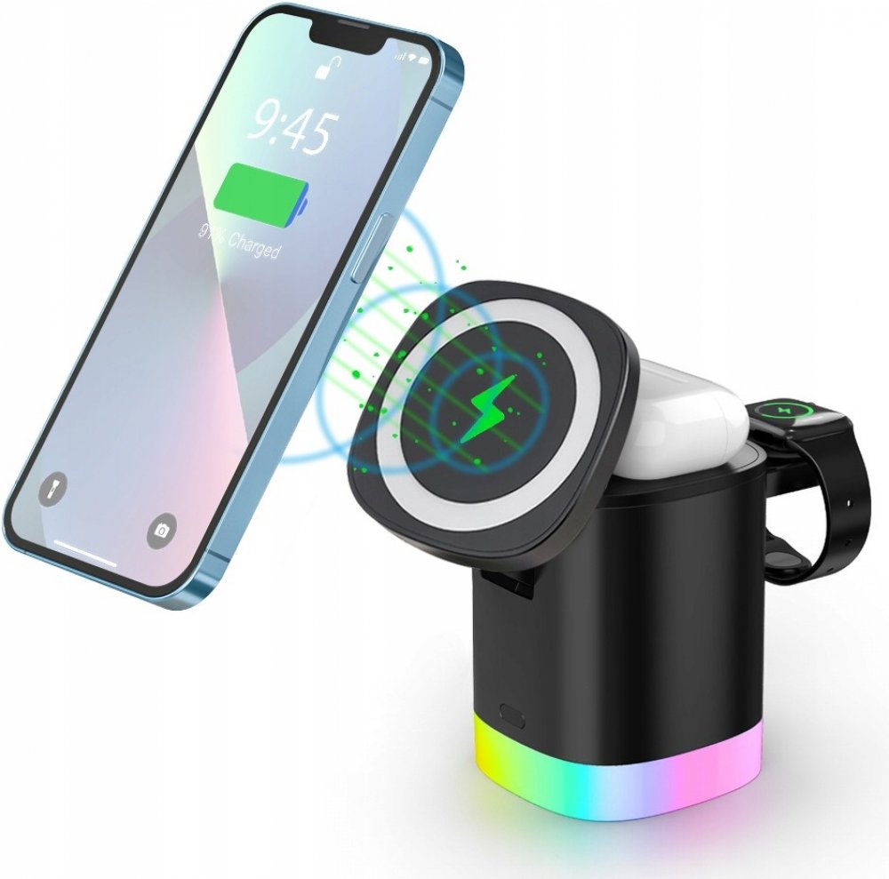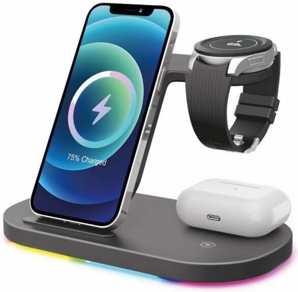 Bezdrátová stanice s podporou rychlého bezdrátového nabíjení o výkonu 15W. Hravě a bezdrátově nabije Váš mobilní telefon, TWS sluchátka a hodinky Samsung Watch – a to všechno najednou!