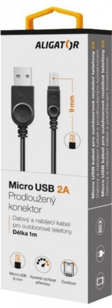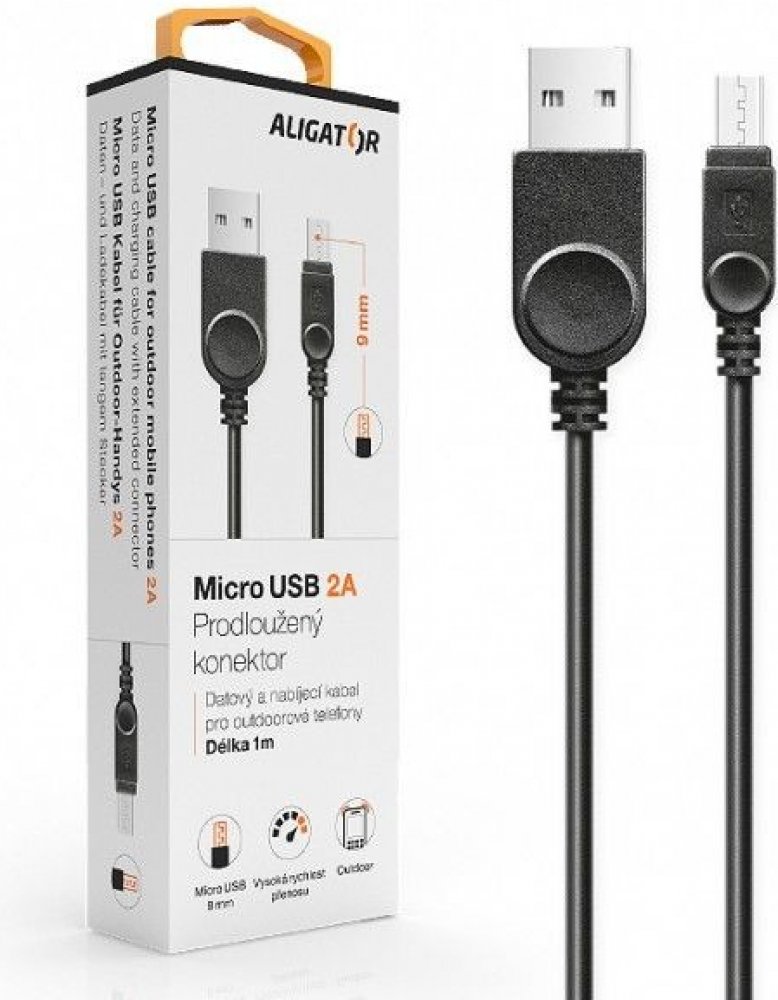 Datový a nabíjecí Micro-USB kabel s prodlouženým konektorem pro outdoorové telefony ALIGATOR: Kabel se vyznačuje extra dlouhým microUSB konektorem pro nabíjení a synchonizaci dat. Kabel je určen zejména pro outdoorové telefony, pro které je standardní délka microUSB konektoru nedostačující. •Vysoce kvalitní konektory