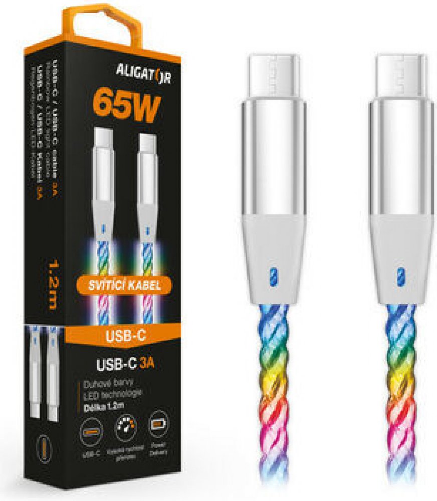 Duhově svítící LED kabel řady ALIGATOR POWER s kovovými konektory USB-C/USB-C nejvyšší kvality, o výkonu 65W a možností nabíjení až 3A. Nudí Vás fádní kabel a přitom je pro Vás výkon na prvním místě? Pak je tento duhově svítící LED kabel tím pravým parťákem!