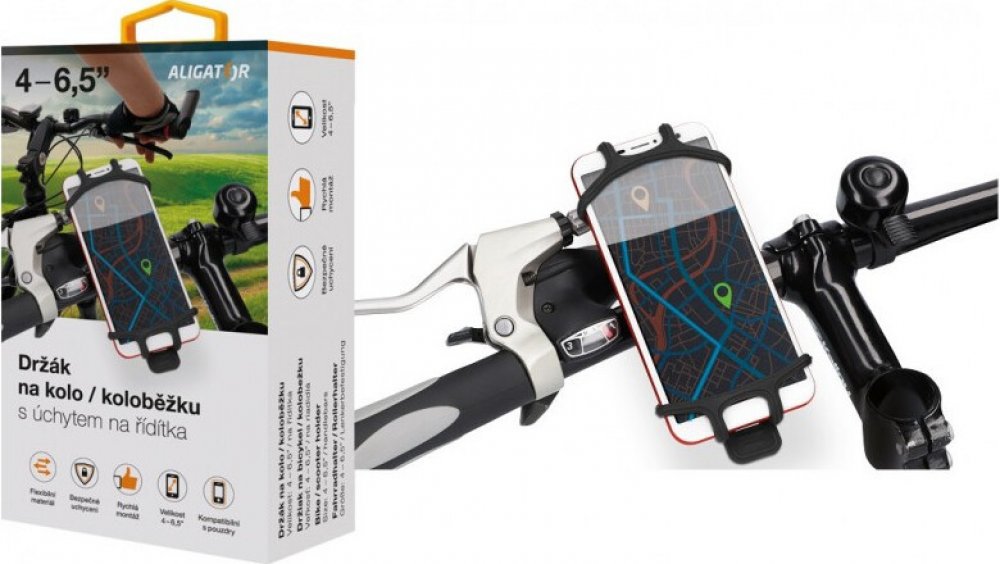 Univerzální držák na řídítka kola/koloběžky nebo kočárku z flexibilního gumového materiálu. Upevnění mobilního telefonu pomocí napínacích a zároveň šetrných gumiček. Spolehlivé a bezpečné uchycení mobilního telefonu ve velikosti 4-6,5“. Decentní minimalistické provedení, které nezabírá na řídítkách tolik místa. Dalšími hlavními přednostmi jsou například sportovní design nebo systém rychlofixace. •...