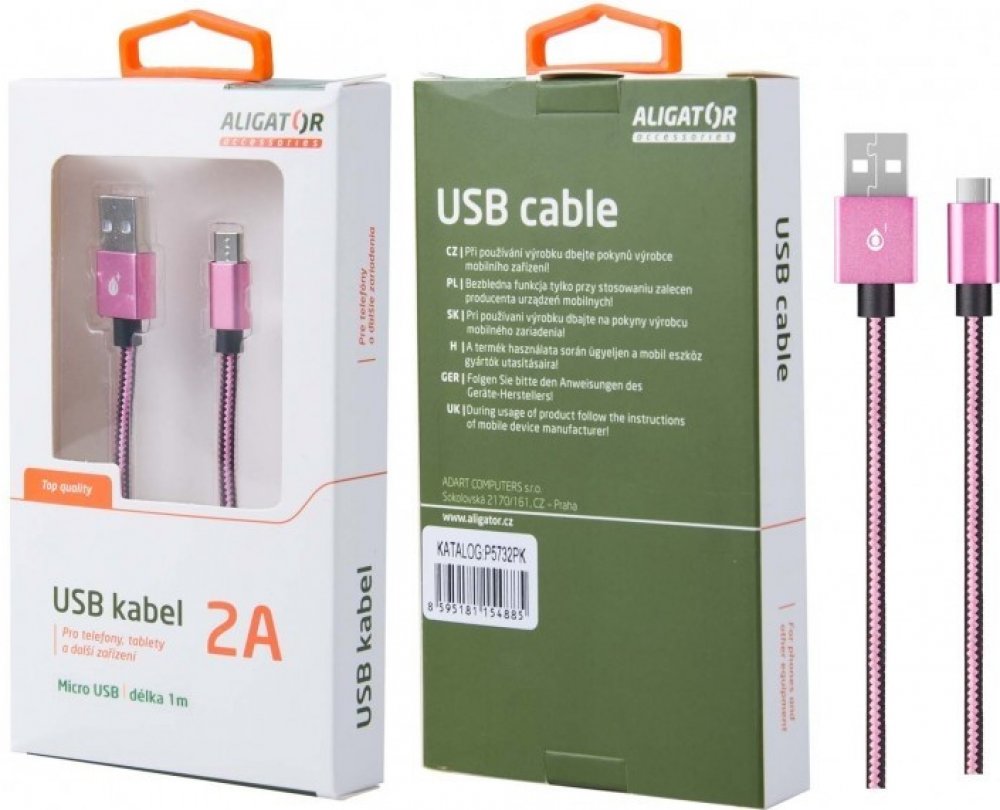 Datový kabel Aligator P5732 Pro MicroUSB 1M opletený v růžové barvěKvalitní micro USB kabel v elegantním provedení.